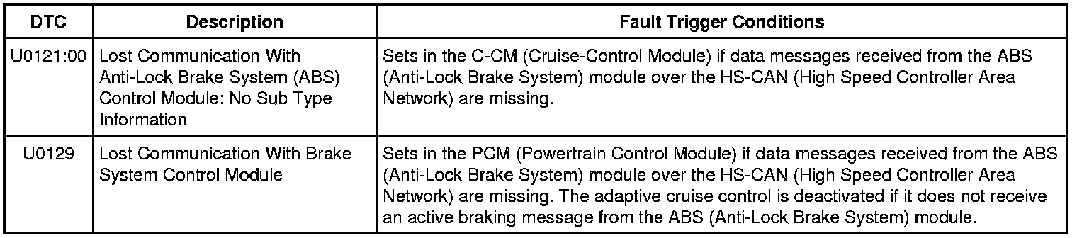 Do both the C-CM (Cruise-Control Module) set DTC (Diagnostic Trouble Code) U0121:00 and the PCM (Powertrain Control Module) set DTC (Diagnostic Trouble Code) U0129?