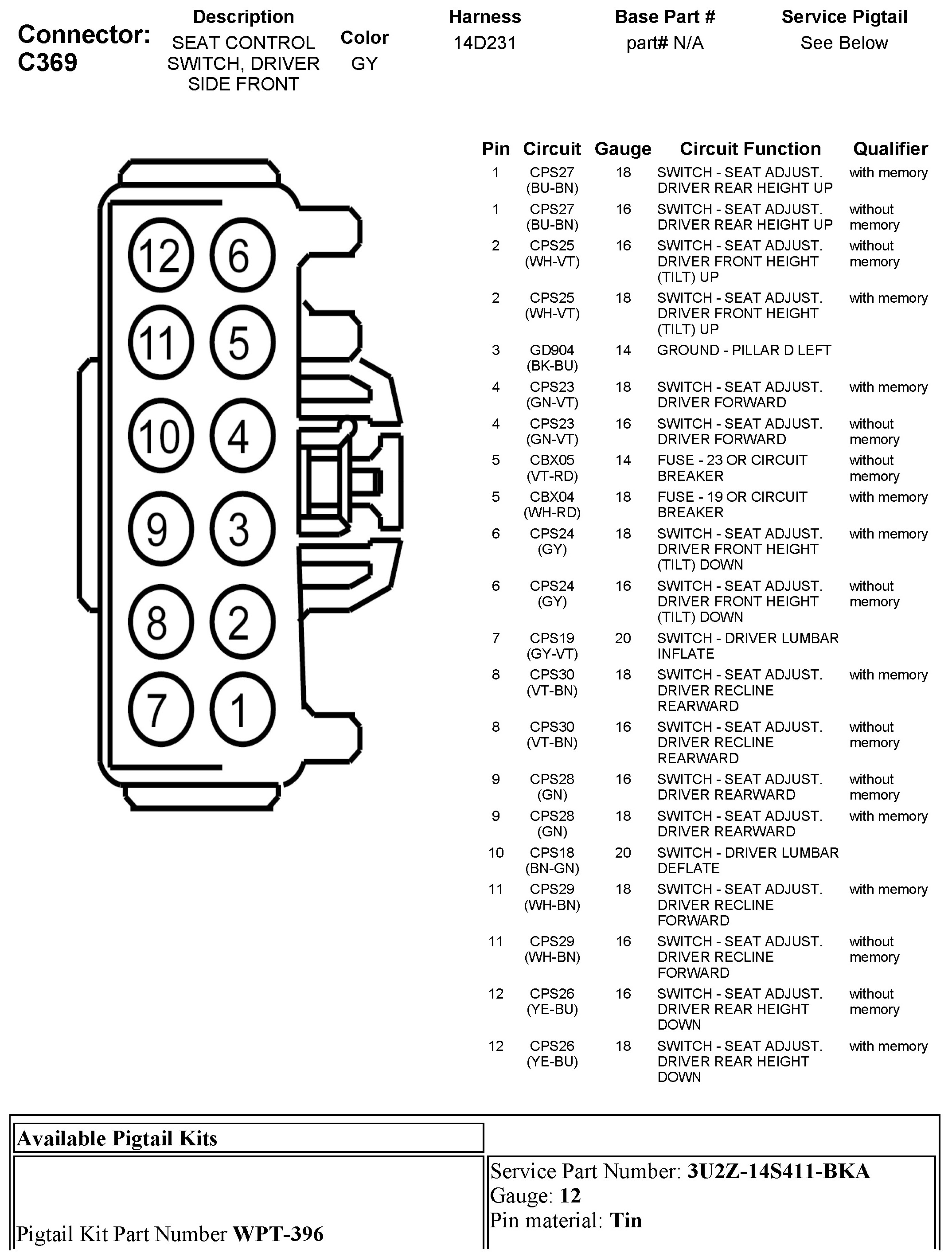 C369 Seat Control Switch, Driver Side Front