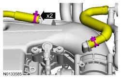 4. Release the clamps and disconnect the power brake booster vacuum supply hose and crankcase ventilation hose from the upper intake manifold.