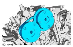 Position the 2 RH (Right Hand) VCT (Variable Camshaft Timing) assemblies and secondary timing chain onto the camshafts by aligning the holes in the VCT (Variable Camshaft Timing) assemblies with the dowel pins in the camshafts.