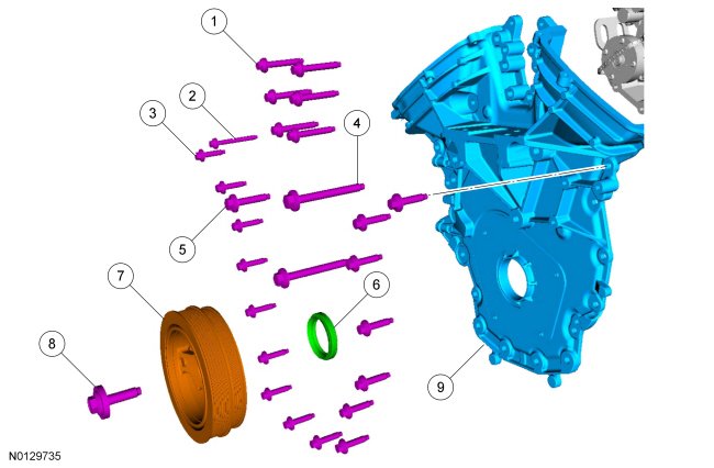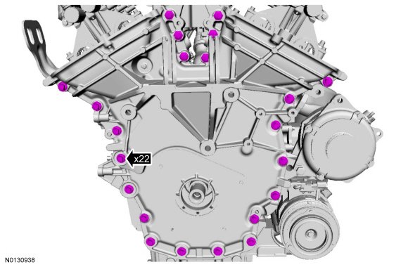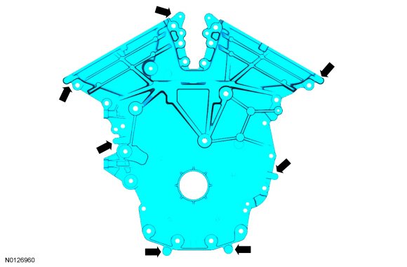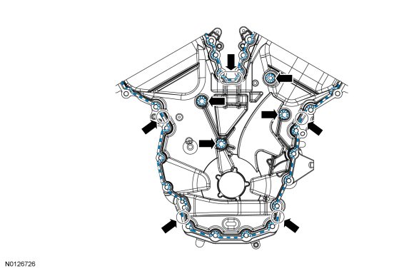NOTE: The engine front cover and bolts 7, 8, 15, 17, 18, 21 and 22 must be installed within 4 minutes of the initial sealant application. The remainder of the engine front cover bolts must be installed and tightened within 35 minutes of the initial sealant application. If the time limits are exceeded, the sealant must be removed, the sealing area cleaned and sealant reapplied. To clean the sealing area, use Motorcraft(R) Silicone Gasket Remover and Motorcraft(R) Metal Surface Prep. Failure to follow this procedure can cause future oil leakage.