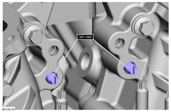 - Apply a 5.5 mm (0.22 in) bead of Motorcraft(R) High Performance Engine RTV Silicone to the oil pan-to-cylinder block joint and the cylinder head-to-cylinder block joint areas of the engine front cover in 5 places as indicated.