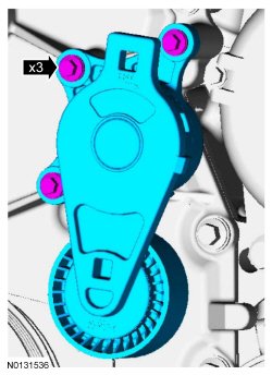 9. Remove the 3 bolts and the accessory drive belt tensioner.