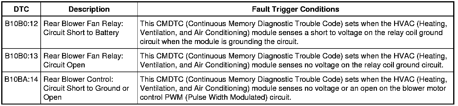 The auxiliary blower motor relay coil receives a ground from the HVAC (Heating, Ventilation, and Air Conditioning) module. When the relay coil is energized, voltage is delivered from the relay to the auxiliary blower motor speed control and auxiliary blower motor. The auxiliary blower motor speed control is grounded. The HVAC (Heating, Ventilation, and Air Conditioning) module provides a PWM (Pulse Width Modulated) signal to the auxiliary blower motor speed control to control the blower speed. Ground for the motor is provided from the auxiliary blower motor speed control.