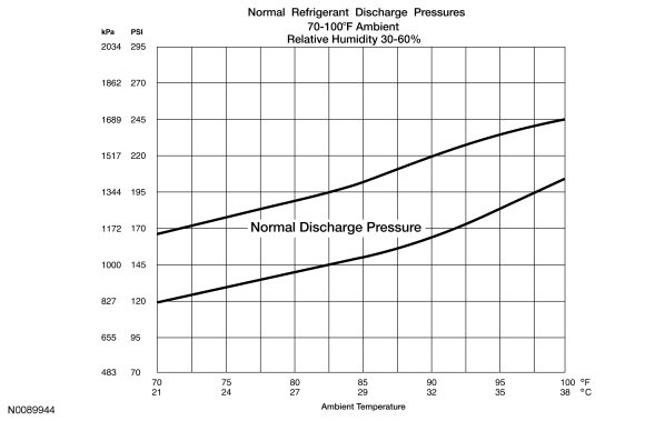 8. Determine if the discharge pressure falls within the normal operating limits using the Normal Refrigerant Discharge Pressures chart.