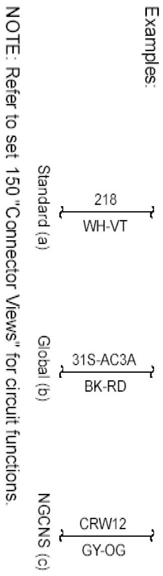 Ford Motor Company uses three different circuit numbering conventions: Standard Circuit Numbering System, Global Circuit Numbering System, and New Global Circuit Numbering System (NGCNS). With each, the circuit number (which identifies a specific circuit function) is followed by the wire color.