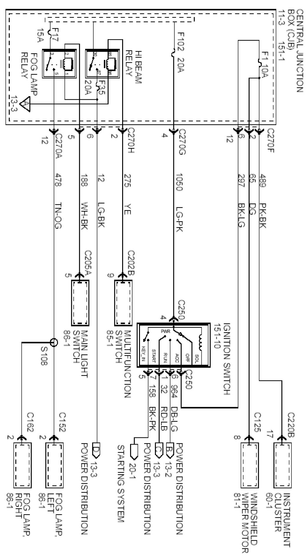 Each set normally starts with the component that powers the circuit, such as a fuse or the ignition switch. Current flow is shown from the power source at the top of the diagram to ground at the bottom of the diagram. A full representation of the power supply of a fuse or the power distribution from a fuse to various components is given in the Power and Ground Distribution Diagrams. Full representation of the ground connections are shown in the Power and Ground Distribution Diagrams.