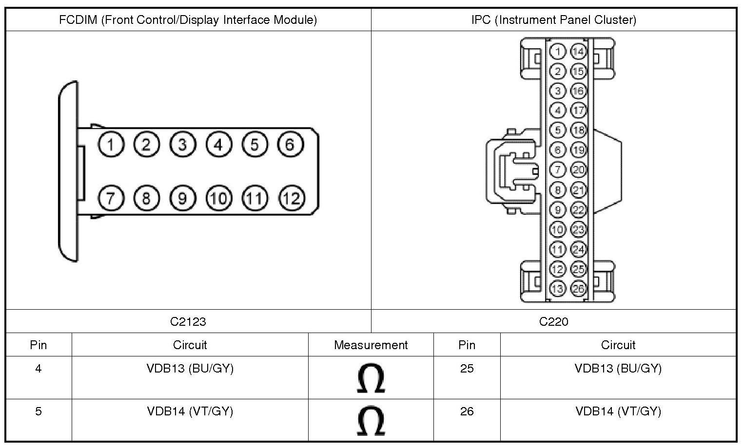 The FCDIM (Front Control/Display Interface Module) communicates with the scan tool through the HS-CAN (High Speed Controller Area Network). The IPC (Instrument Panel Cluster) is used as the gateway module.
