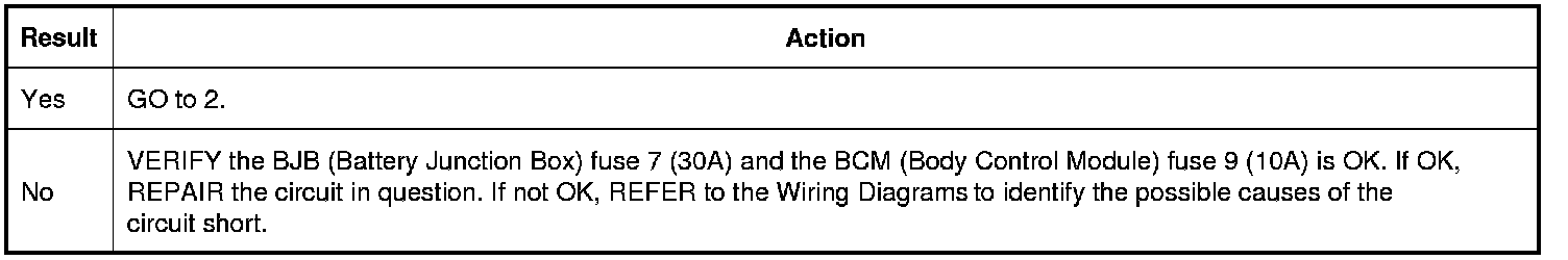 Verify BJB (Battery Junction Box) fuse 7 (30A) and BCM (Body Control Module) fuse 9 (10A) are OK.