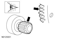 2. Inspect the wear patterns on the starter drive and the flywheel or flexplate ring gear. If the wear pattern is normal, install the starter motor. REFER to Starter Motor - 2.0L GTDI or REFER to Starter Motor - 3.5L Ti-VCT .