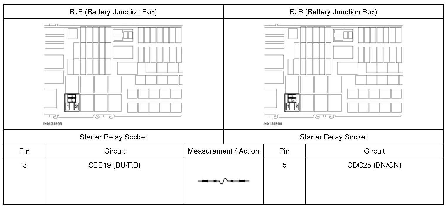 When the ignition switch is turned to the START position, the BCM (Body Control Module) and PCM (Powertrain Control Module) receive a request to crank the engine. When the PCM (Powertrain Control Module) receives the correct inputs from the BCM (Body Control Module) and notification from the TR (Transmission Range) sensor that the gear selector is in PARK or NEUTRAL, the PCM (Powertrain Control Module) then supplies voltage and ground to the starter relay coil. The energized coil causes the starter relay contacts to close. This allows voltage to be supplied from the BJB (Battery Junction Box) to the starter solenoid coil. The starter solenoid coil is grounded at the starter motor. Energizing the starter solenoid closes the solenoid contacts allowing voltage directly from the battery to the starter motor, engaging the starter drive into the ring gear causing the engine to crank. The PCM (Powertrain Control Module) disengages the starter motor once an engine RPM (Revolutions Per Minute) threshold is reached, a set crank time is exceeded or the ignition switch has been turned to the OFF position.