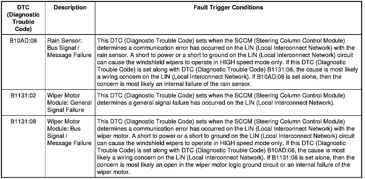 When the wiper/washer switch is in the HIGH position, the windshield wiper motor also receives a ground signal which is hardwired directly through the SCCM (Steering Column Control Module) (bypassing the logic within the module). This fail-safe circuit makes sure that the windshield wipers function in HIGH speed mode in the event of a LIN (Local Interconnect Network) communication failure.