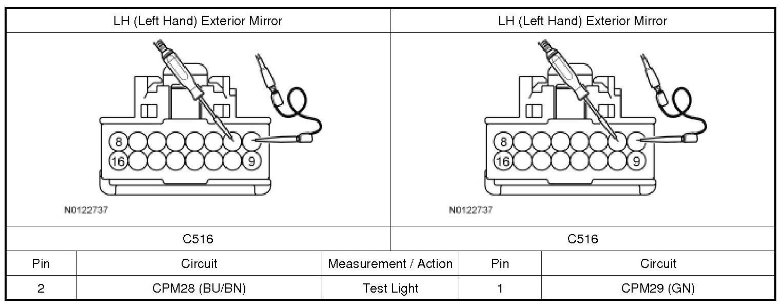5. For incorrectly operating LH (Left Hand) mirror, while using the exterior mirror control switch in the right, left and released positions, monitor: