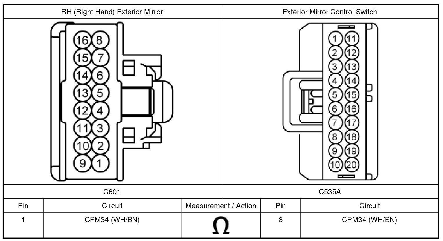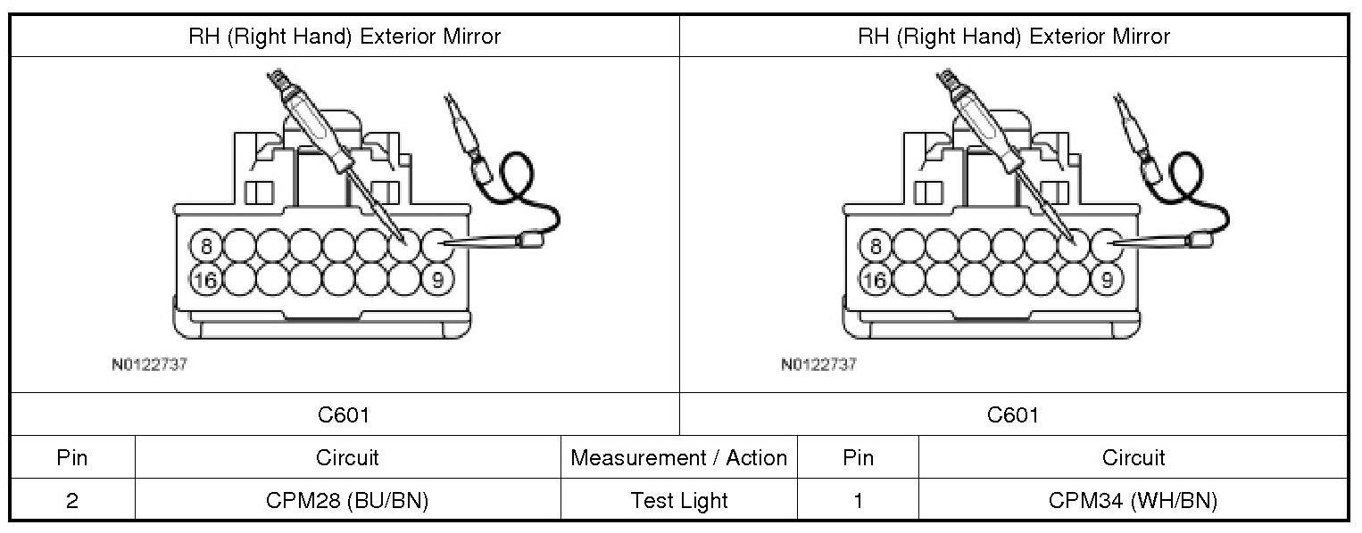 6. For incorrectly operating RH (Right Hand) mirror, while using the exterior mirror control switch in the right, left and released positions, monitor: