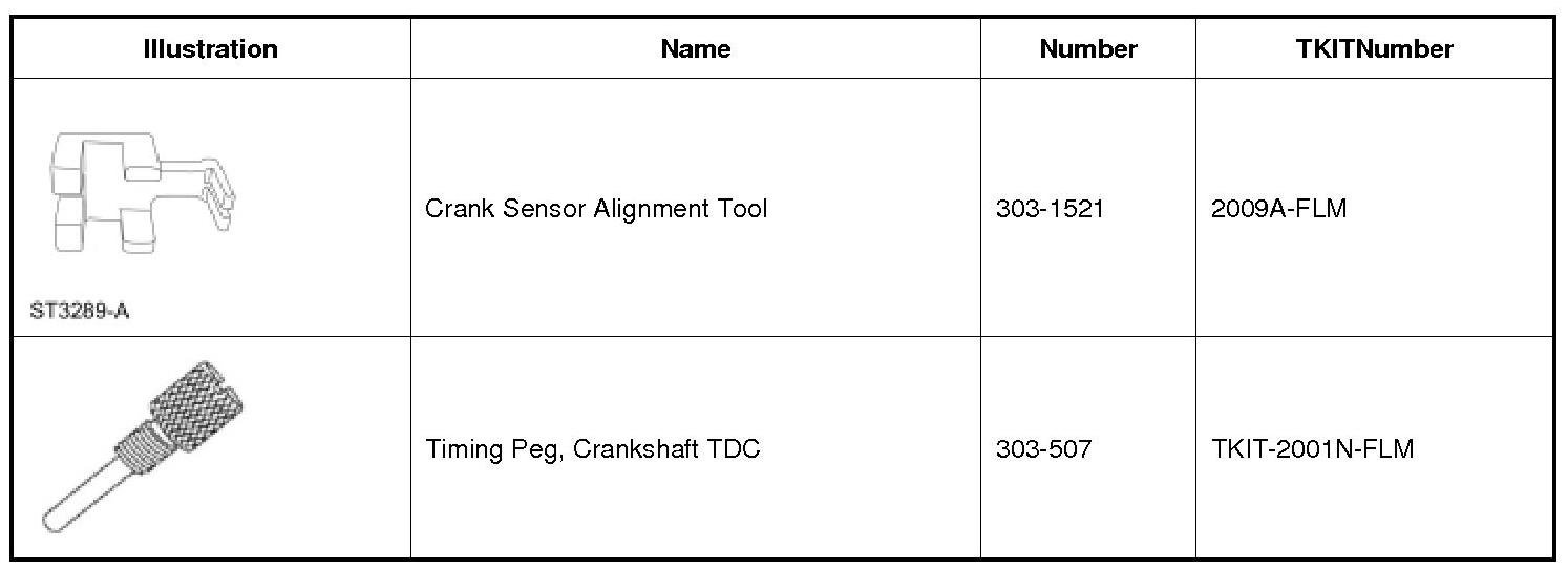 3. Install the 303-1521. If the 303-1521 does not align with the TDC (Top Dead Center) marked tooth on the crankshaft pulley, loosen the 2 CKP (Crankshaft Position) sensor bolts and adjust the sensor until the tool is installed.