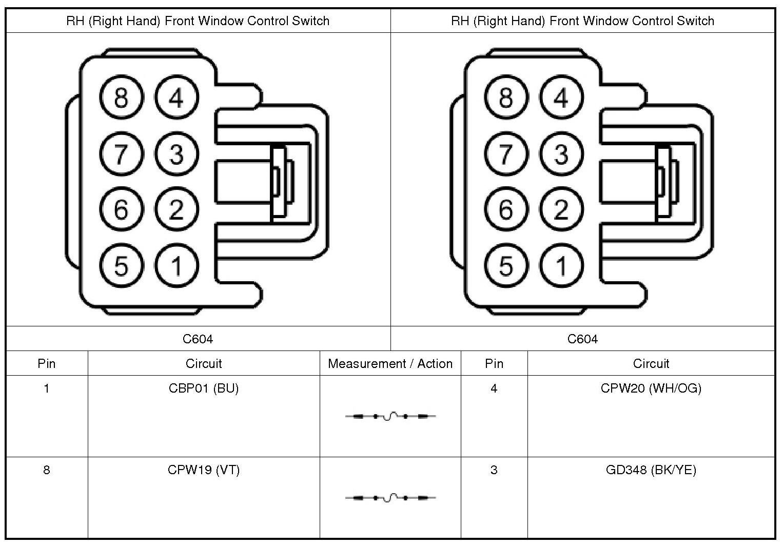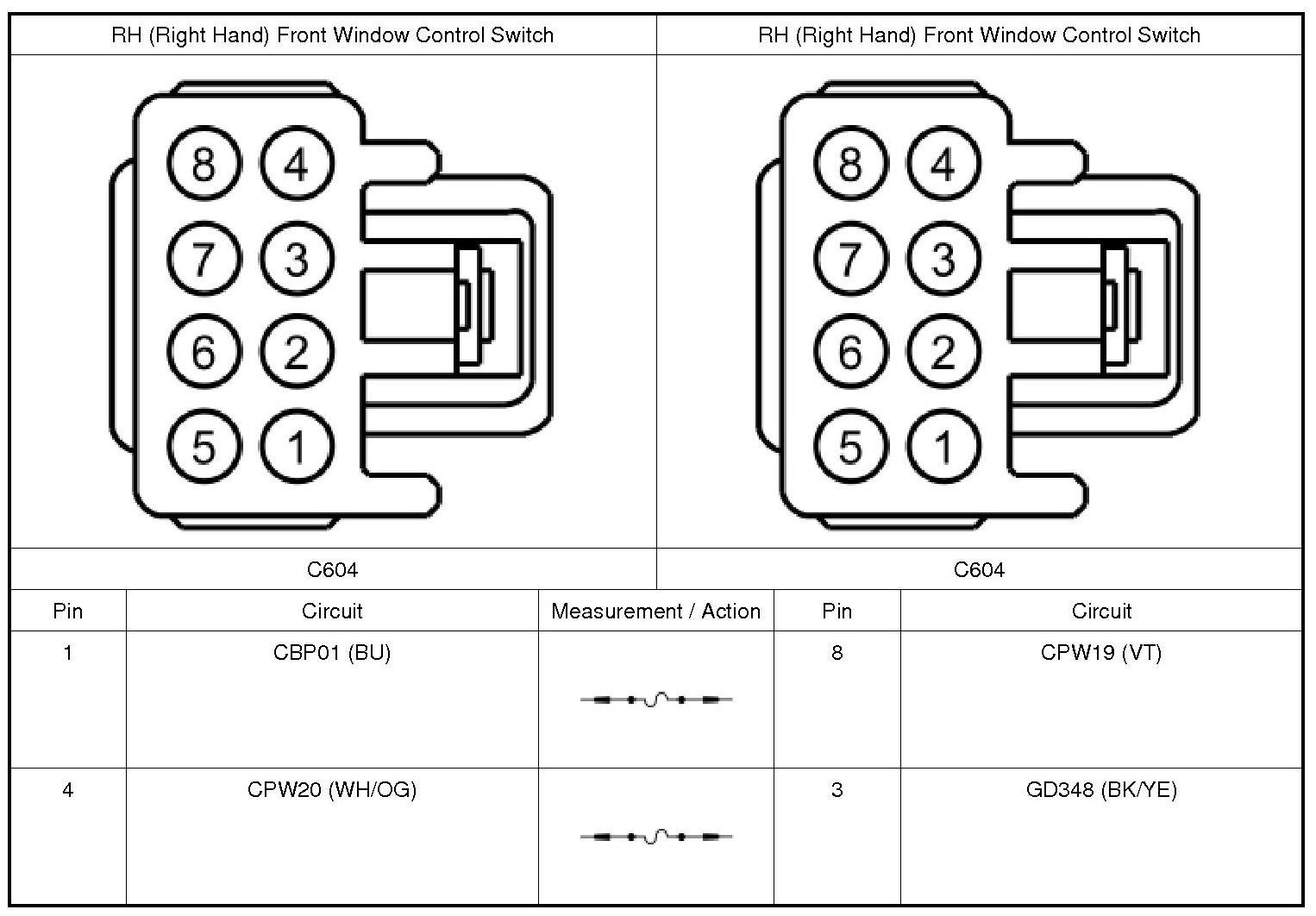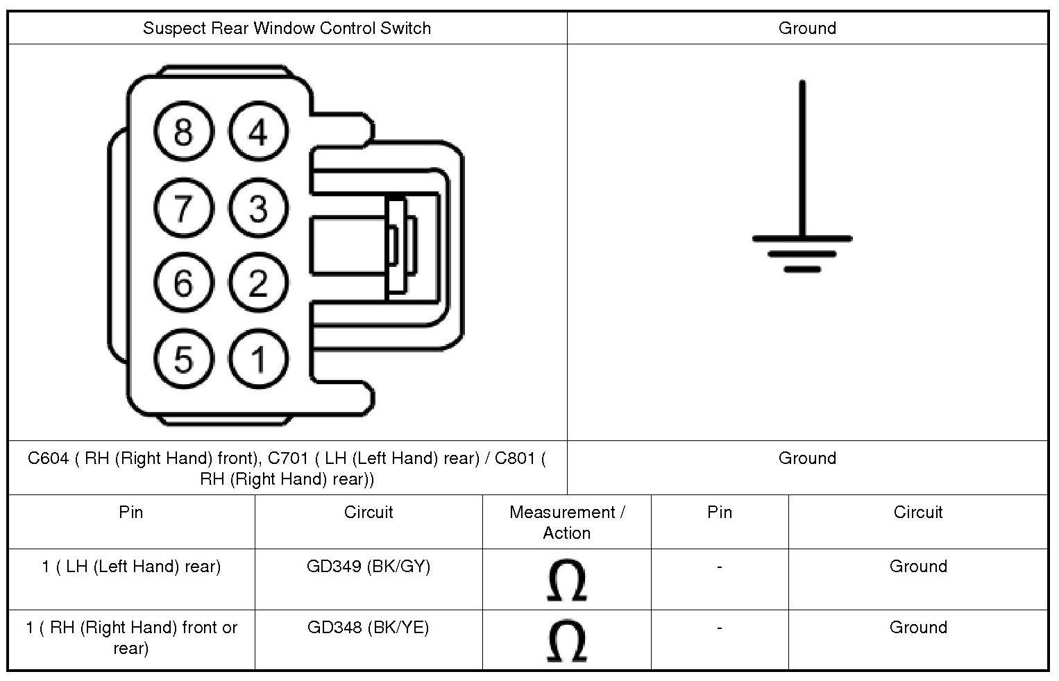 2. Disconnect: Suspect RH (Right Hand) Front Window Control Switch C604, Rear Window Control Switch C701 (LH (Left Hand)) or C801 (RH (Right Hand)).