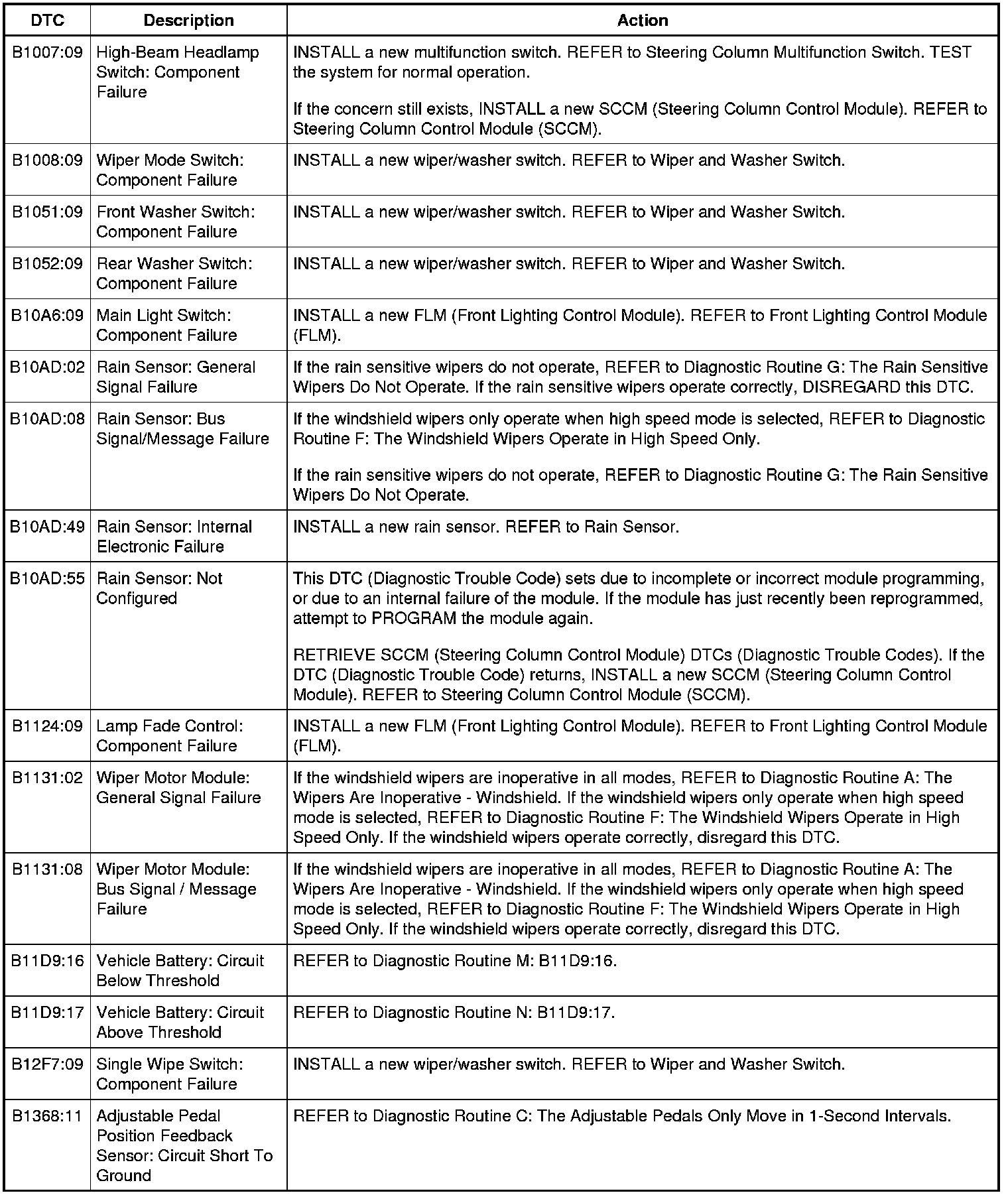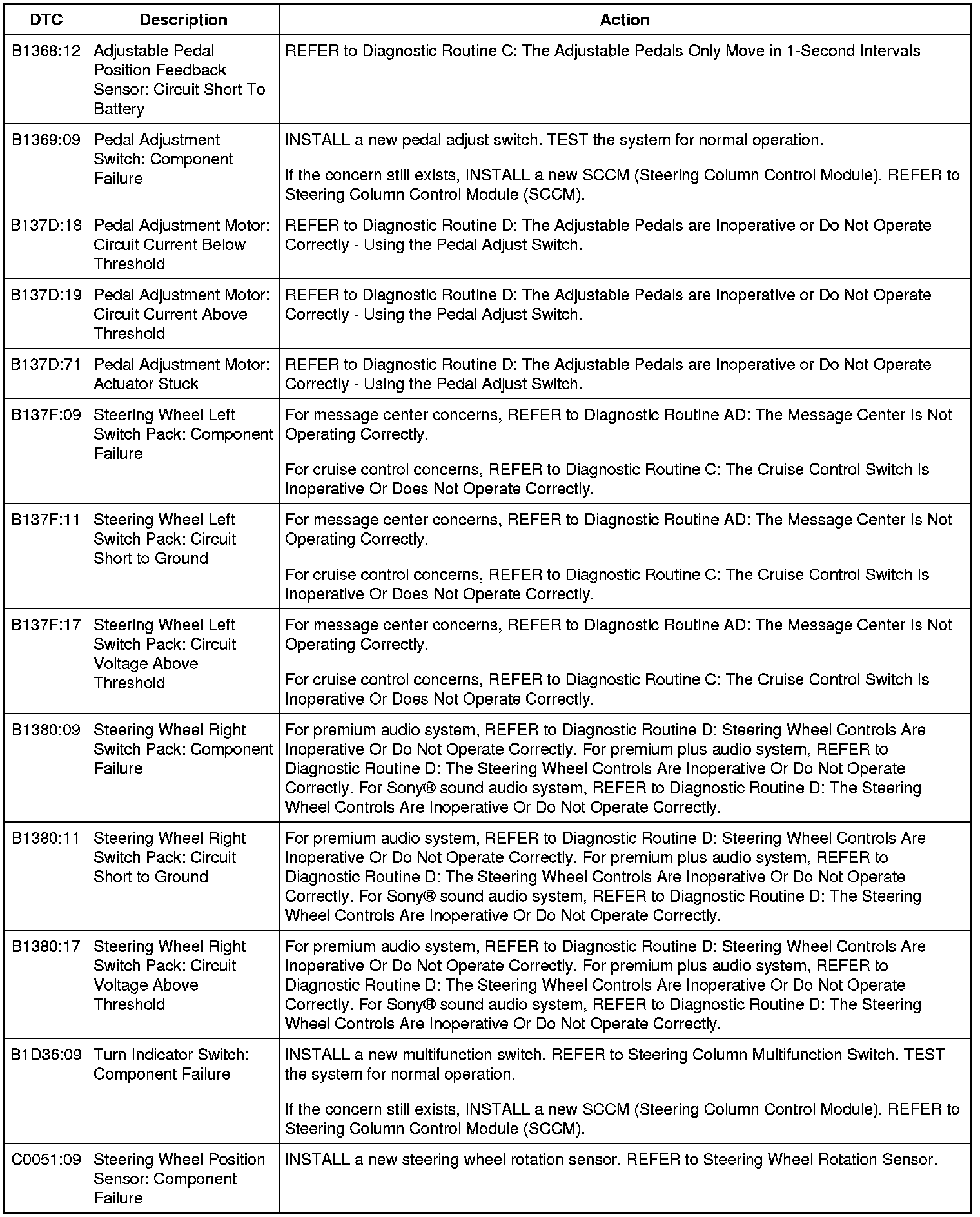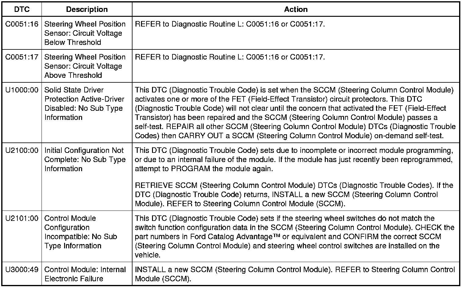 DTC Chart: Steering Column Control Module (SCCM)