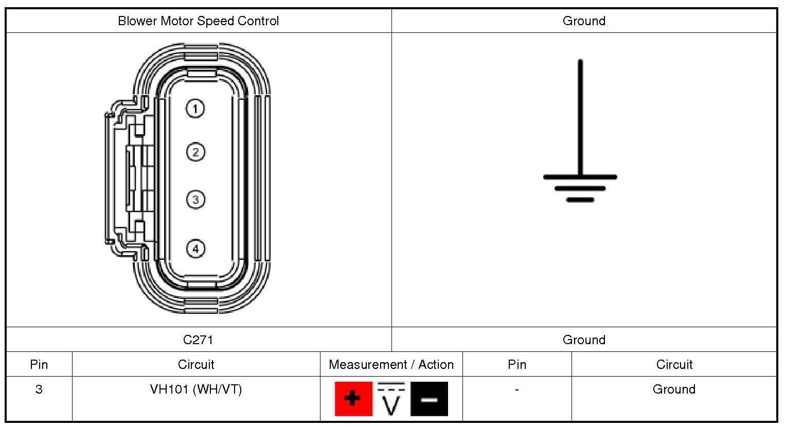 When the blower motor relay coil receives a ground from the HVAC (Heating, Ventilation, and Air Conditioning) module, the relay coil is energized and voltage is delivered to the blower motor and the blower motor speed control from the relay. Ground for the motor is provided from the blower motor speed control. Ground is provided for the blower control module. The HVAC (Heating, Ventilation, and Air Conditioning) module sends a PWM (Pulse Width Modulated) signal to the blower motor speed control to control the blower speed.