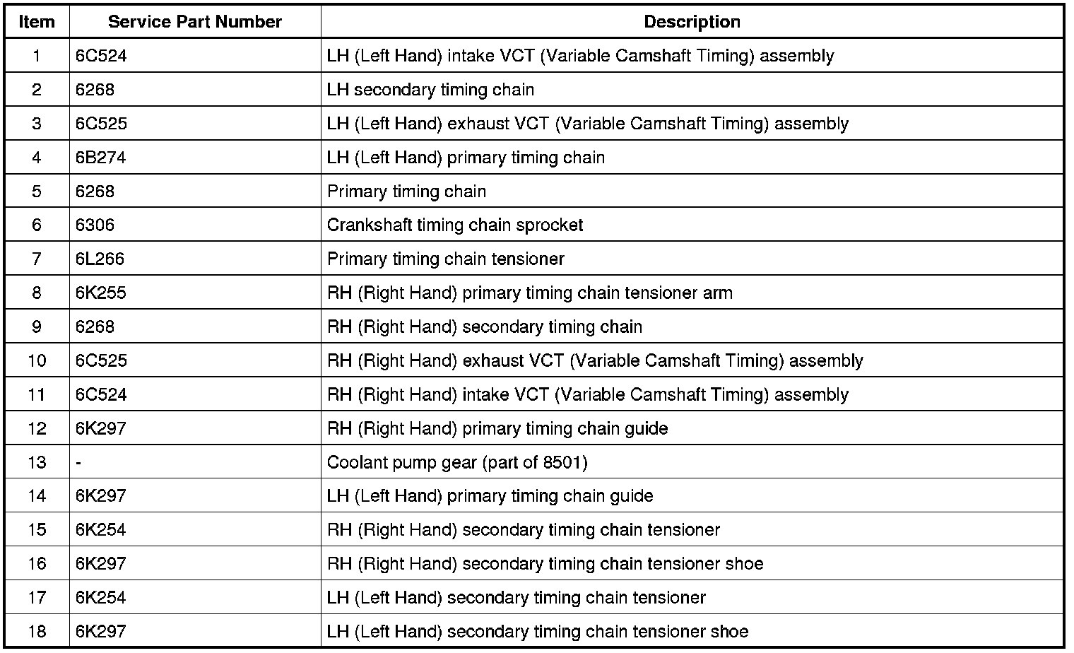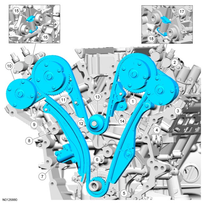- There is 35 links in between LH (Left Hand) intake VCT (Variable Camshaft Timing) assembly colored link (2) and the 2 crankshaft sprocket links (3).