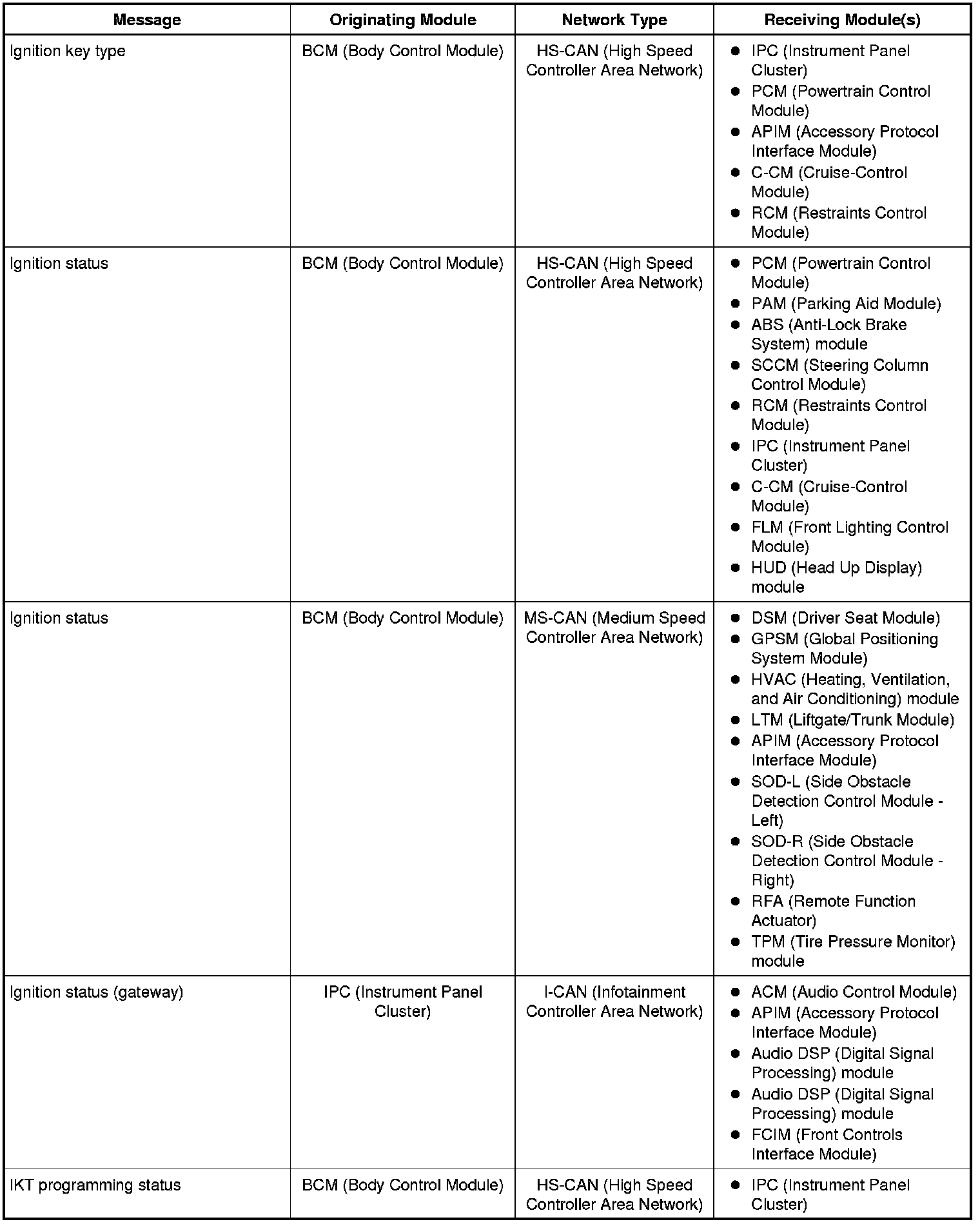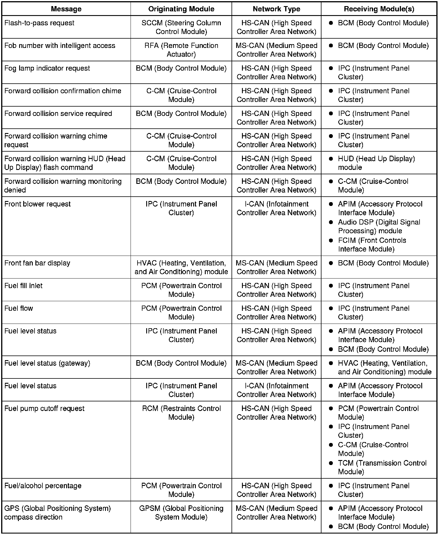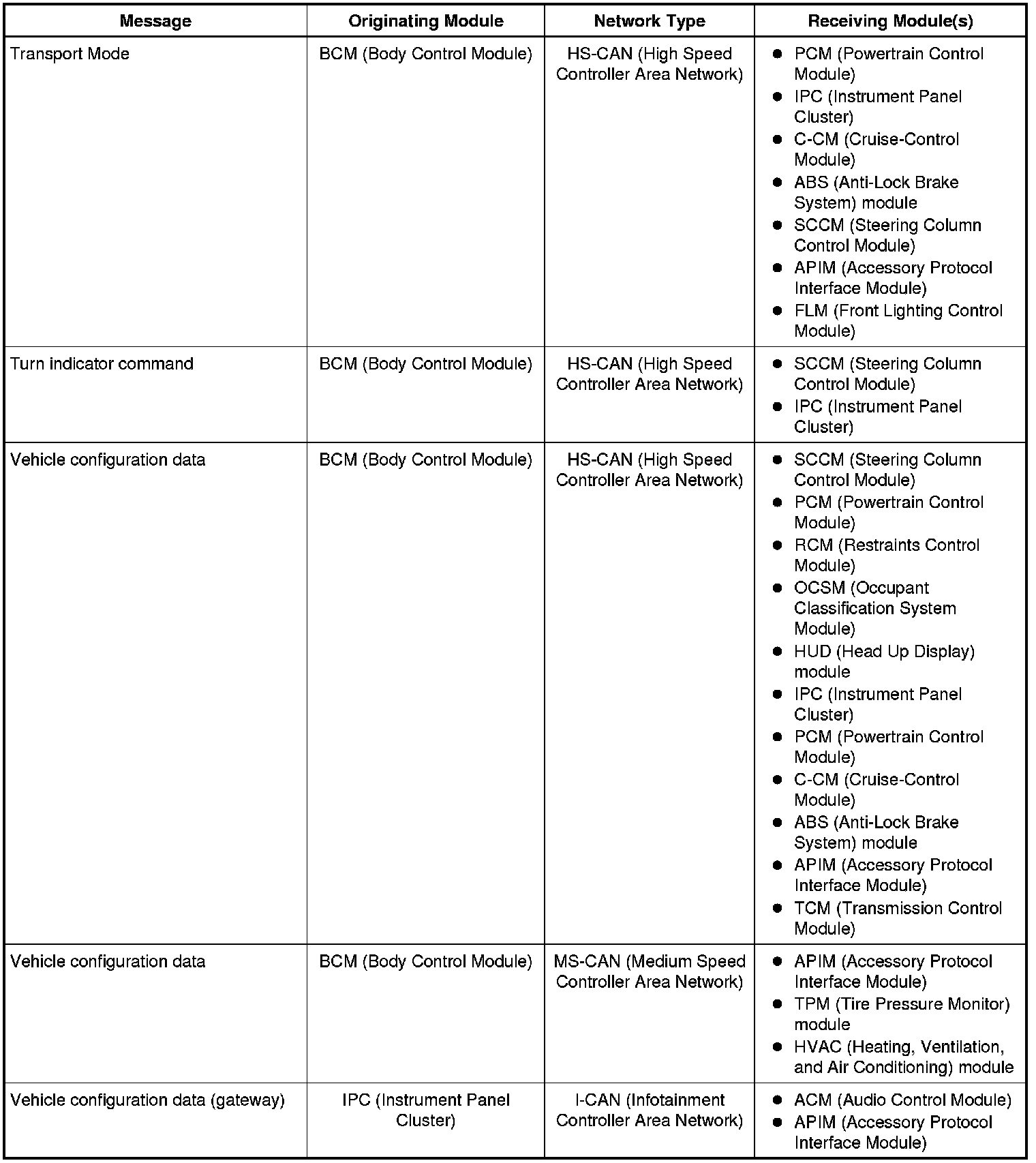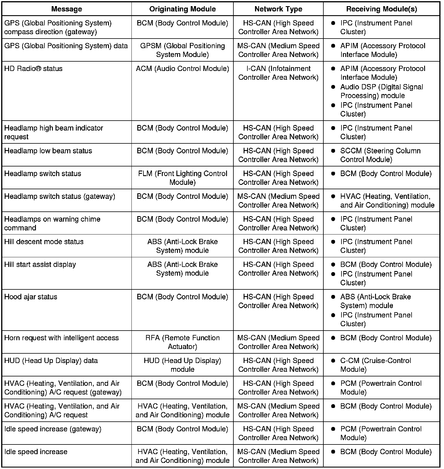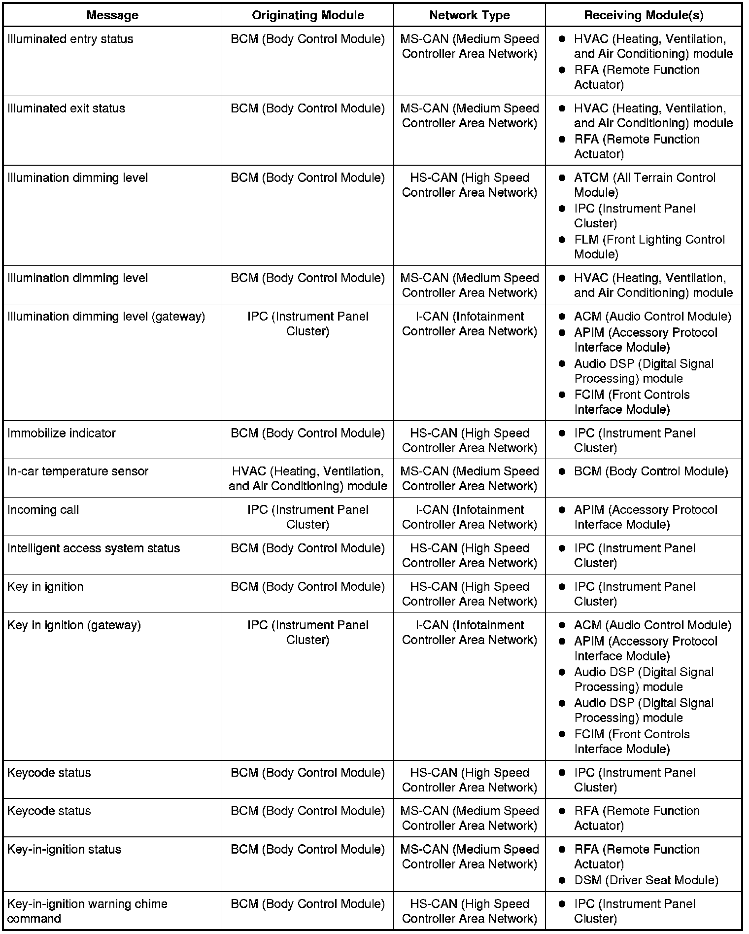 The IPC (Instrument Panel Cluster) and BCM (Body Control Module) are gateway modules. The IPC (Instrument Panel Cluster) translates messages on the HS-CAN (High Speed Controller Area Network) to the I-CAN (Infotainment Controller Area Network) and vice versa. The BCM (Body Control Module) translates messages on the HS-CAN (High Speed Controller Area Network) to the MS-CAN (Medium Speed Controller Area Network) and vice versa. This allows a message to be distributed throughout all three networks.