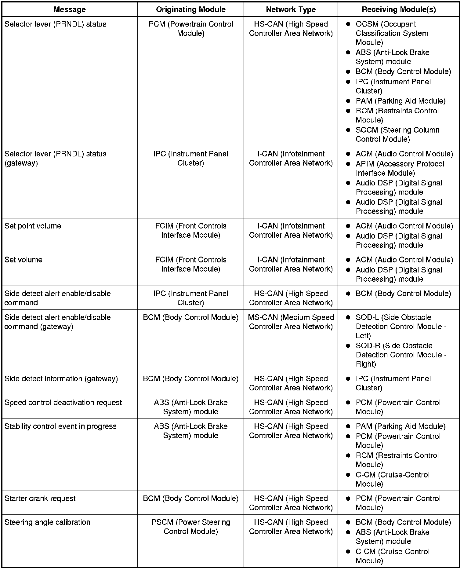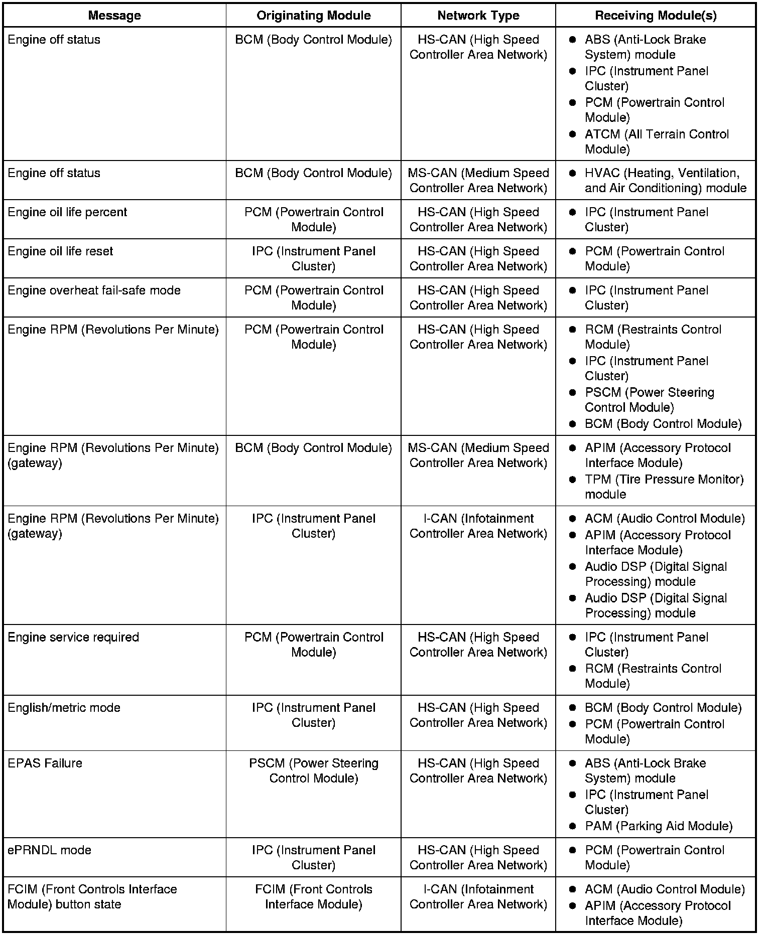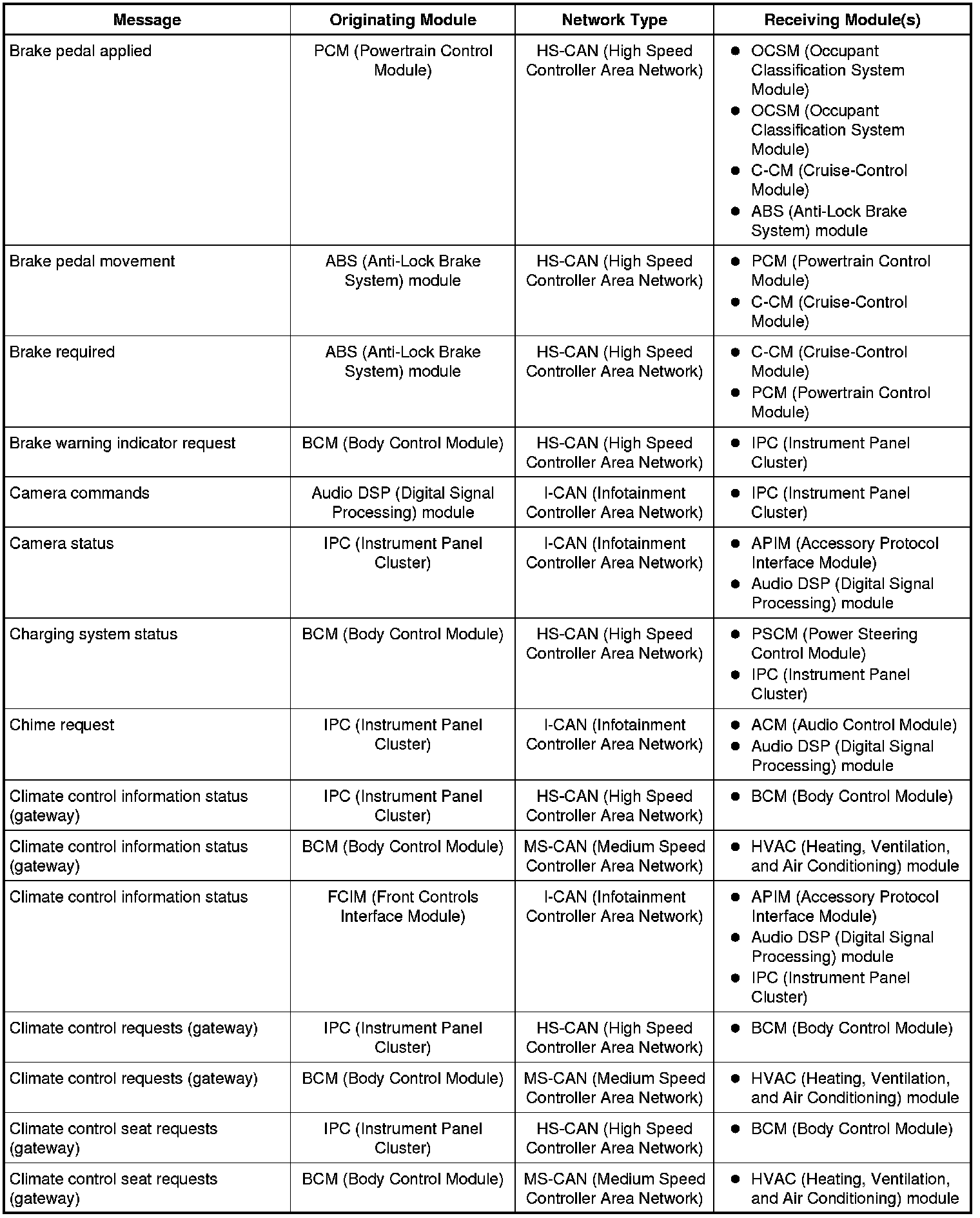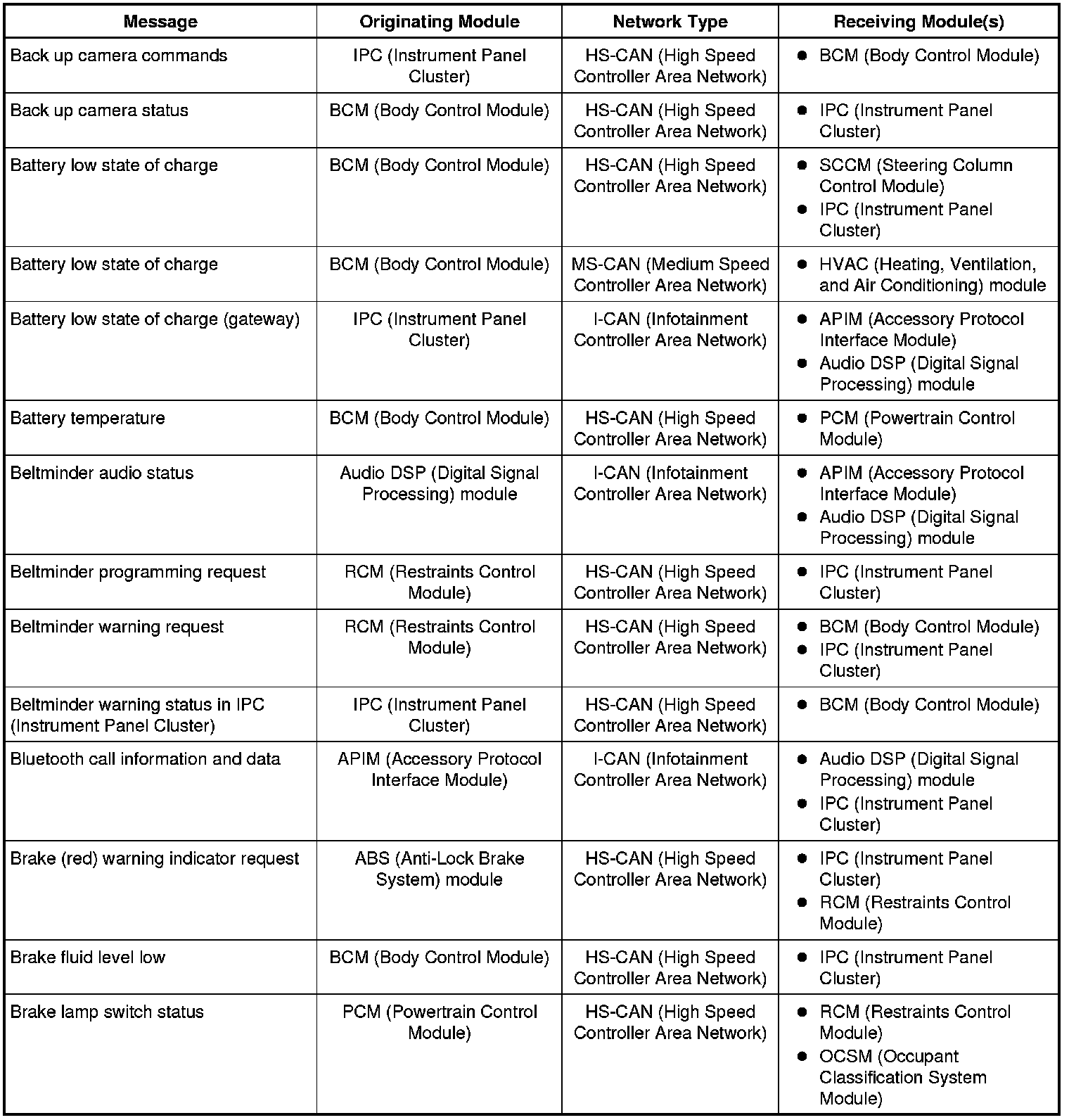 The IPC (Instrument Panel Cluster) and BCM (Body Control Module) are gateway modules. The IPC (Instrument Panel Cluster) translates messages on the HS-CAN (High Speed Controller Area Network) to the I-CAN (Infotainment Controller Area Network) and vice versa. The BCM (Body Control Module) translates messages on the HS-CAN (High Speed Controller Area Network) to the MS-CAN (Medium Speed Controller Area Network) and vice versa. This allows a message to be distributed throughout all three networks.