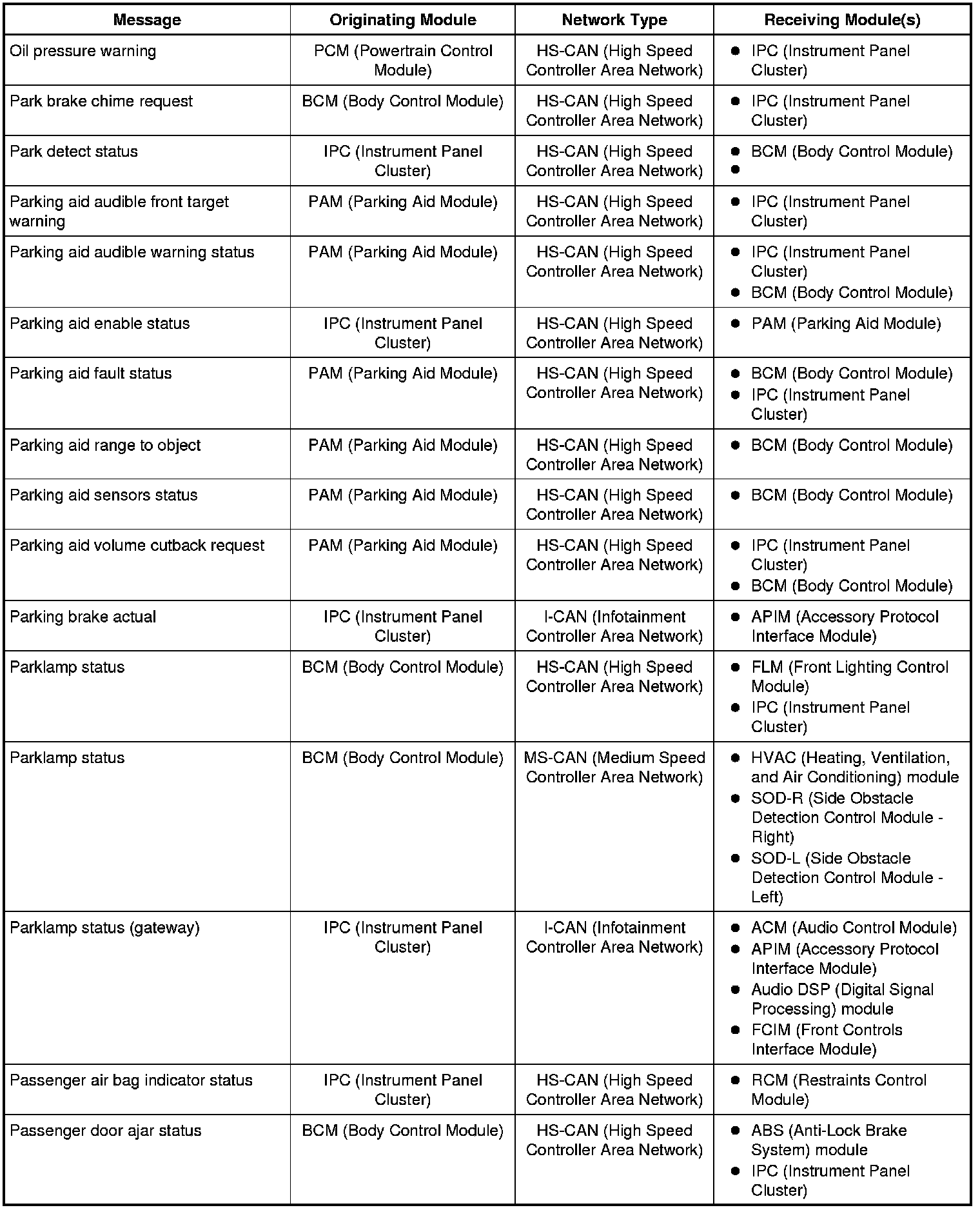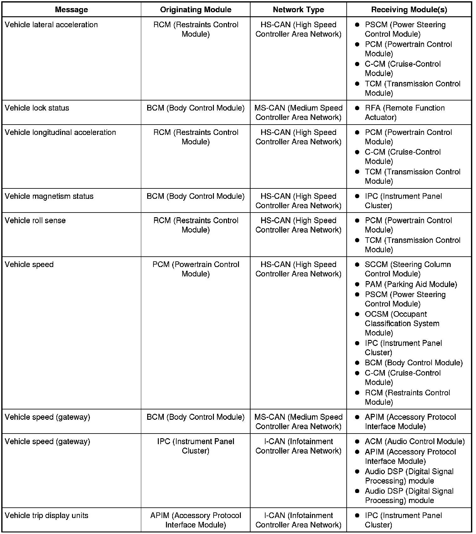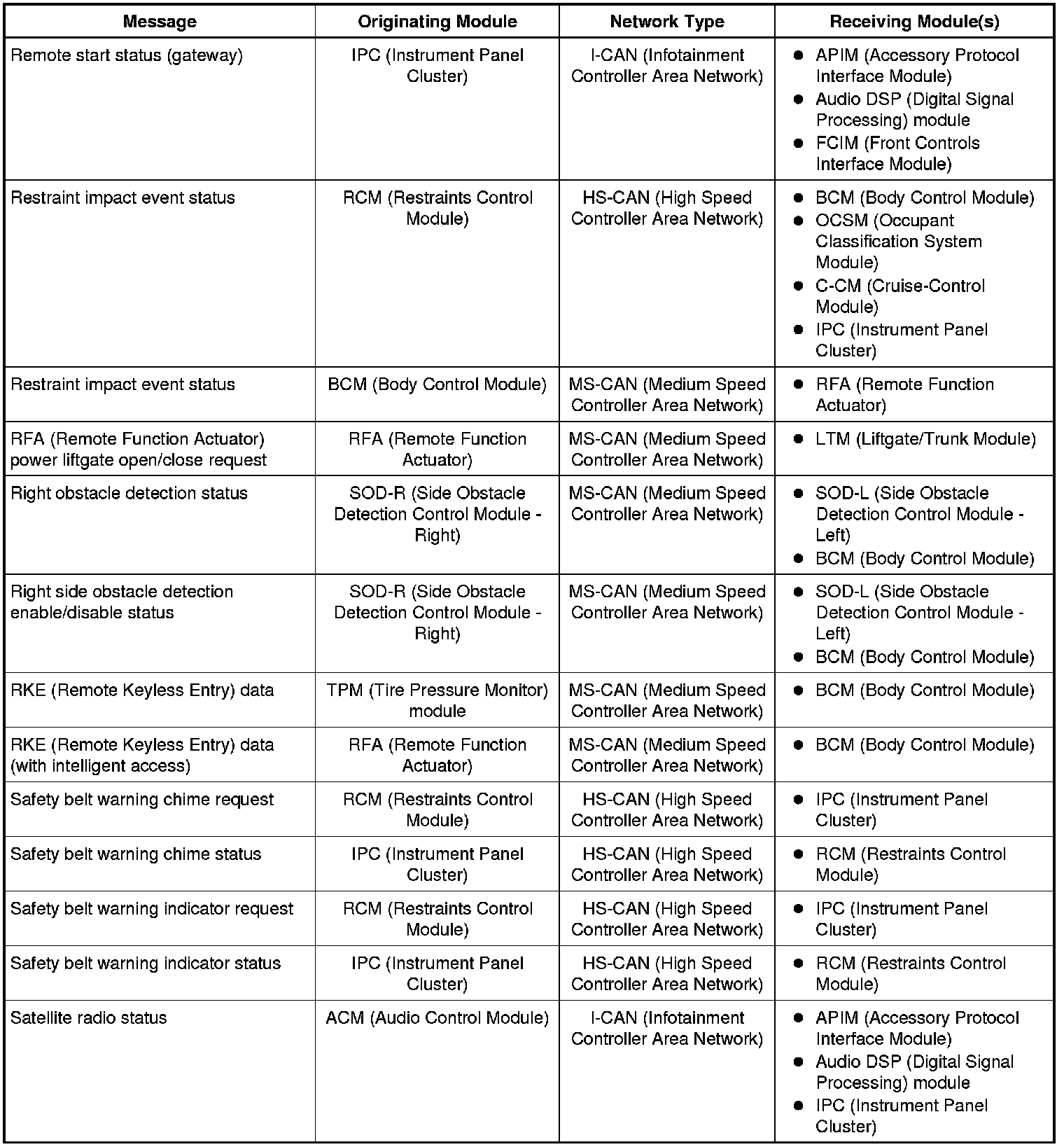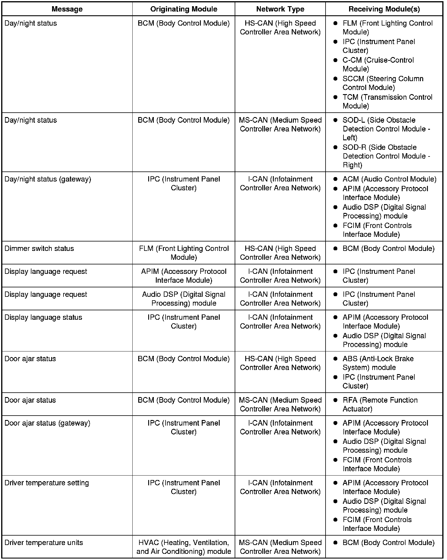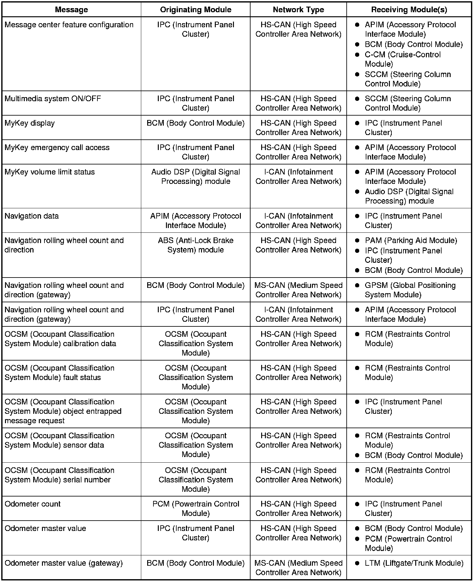 The IPC (Instrument Panel Cluster) and BCM (Body Control Module) are gateway modules. The IPC (Instrument Panel Cluster) translates messages on the HS-CAN (High Speed Controller Area Network) to the I-CAN (Infotainment Controller Area Network) and vice versa. The BCM (Body Control Module) translates messages on the HS-CAN (High Speed Controller Area Network) to the MS-CAN (Medium Speed Controller Area Network) and vice versa. This allows a message to be distributed throughout all three networks.