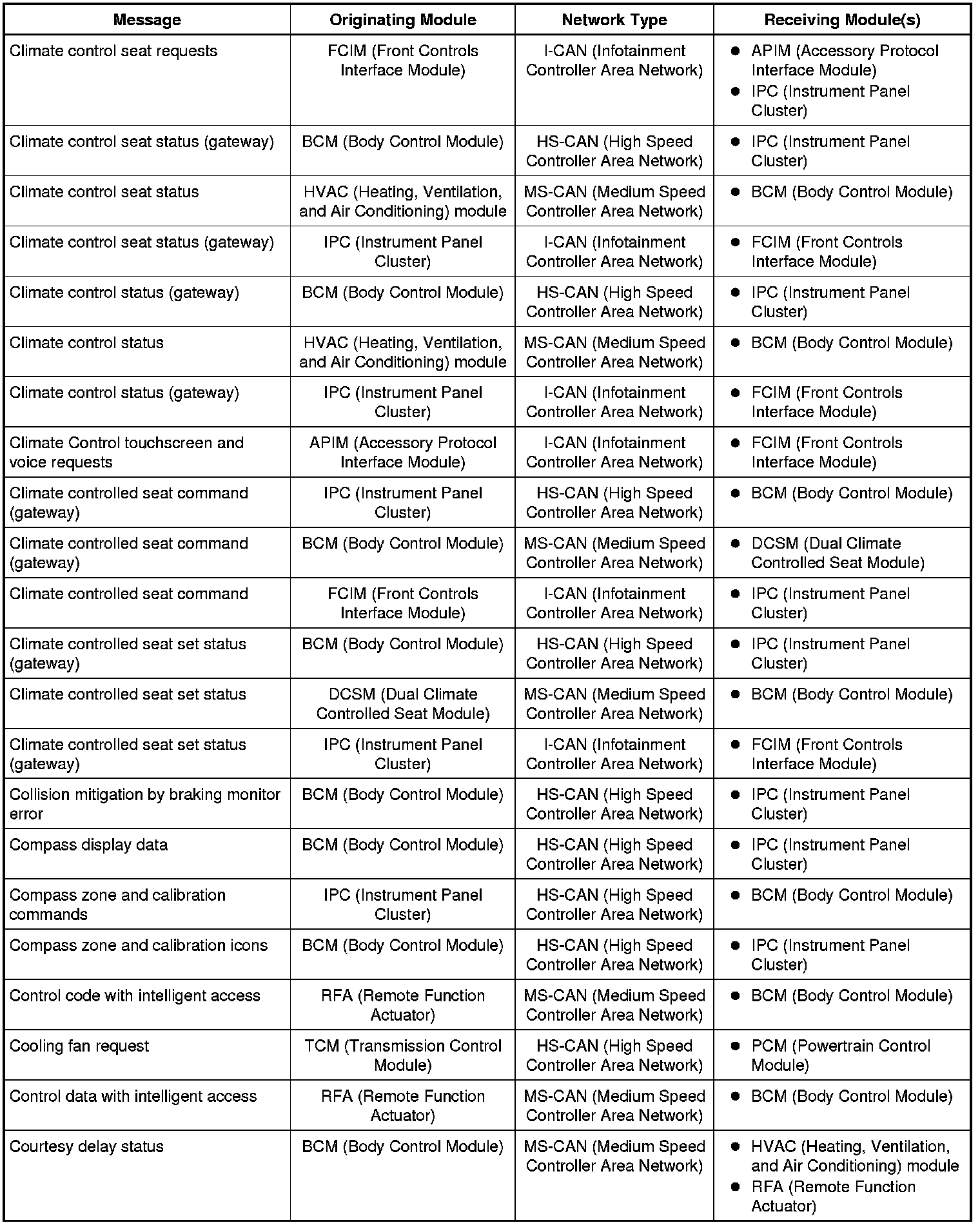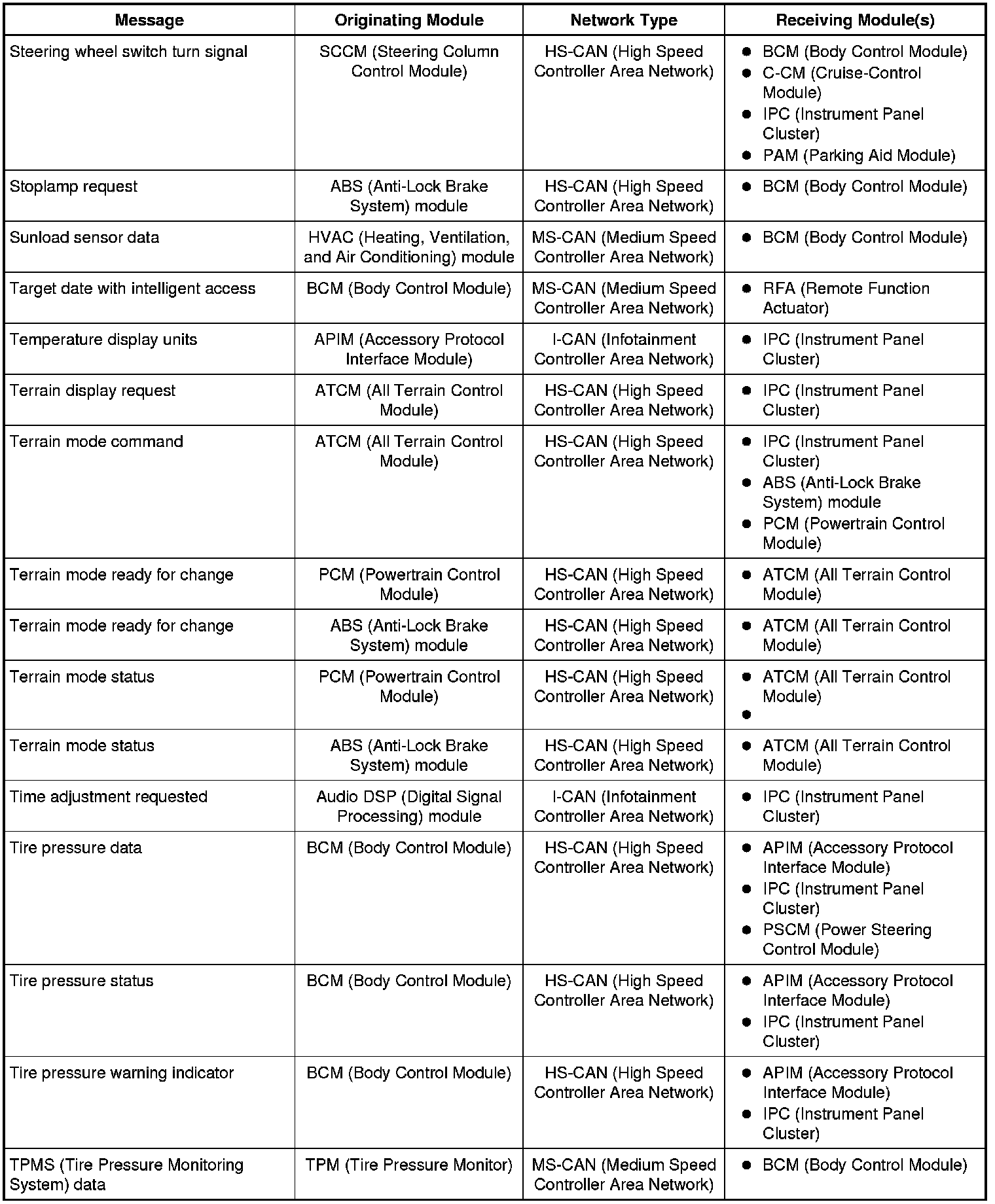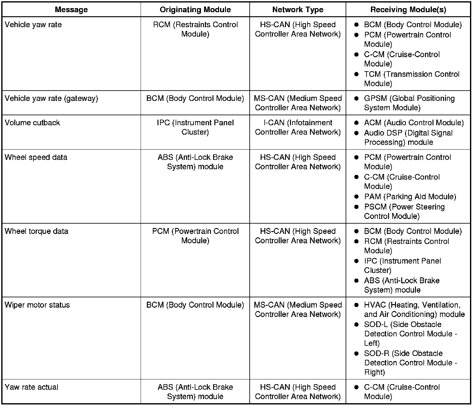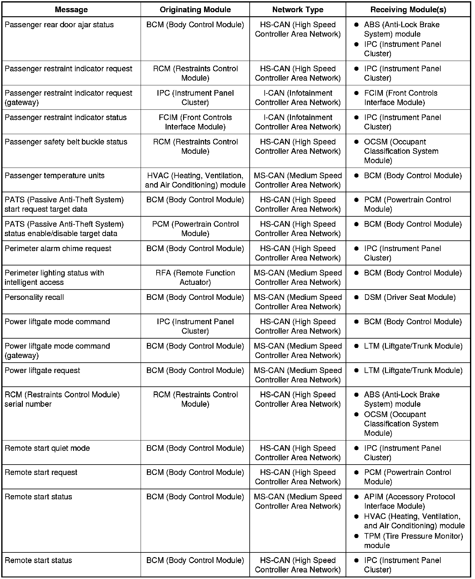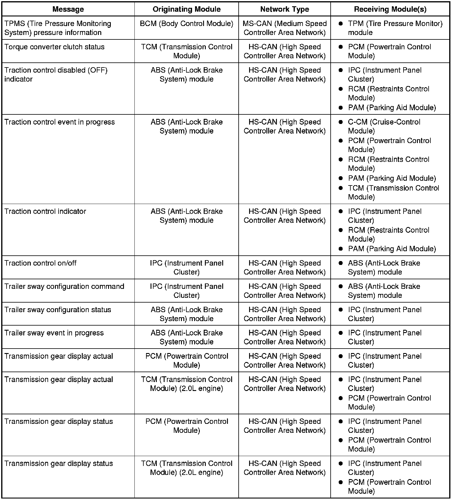 The IPC (Instrument Panel Cluster) and BCM (Body Control Module) are gateway modules. The IPC (Instrument Panel Cluster) translates messages on the HS-CAN (High Speed Controller Area Network) to the I-CAN (Infotainment Controller Area Network) and vice versa. The BCM (Body Control Module) translates messages on the HS-CAN (High Speed Controller Area Network) to the MS-CAN (Medium Speed Controller Area Network) and vice versa. This allows a message to be distributed throughout all three networks.