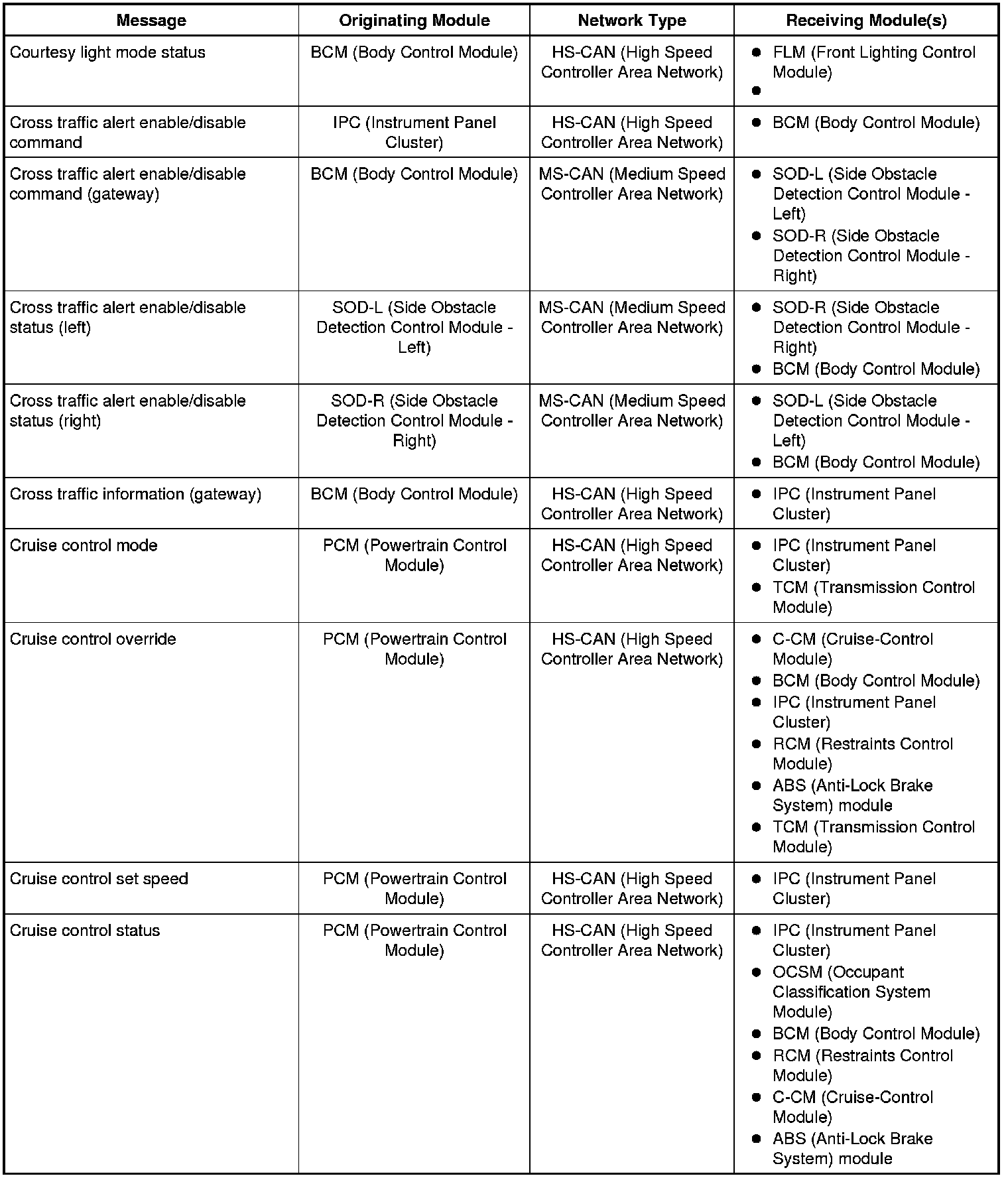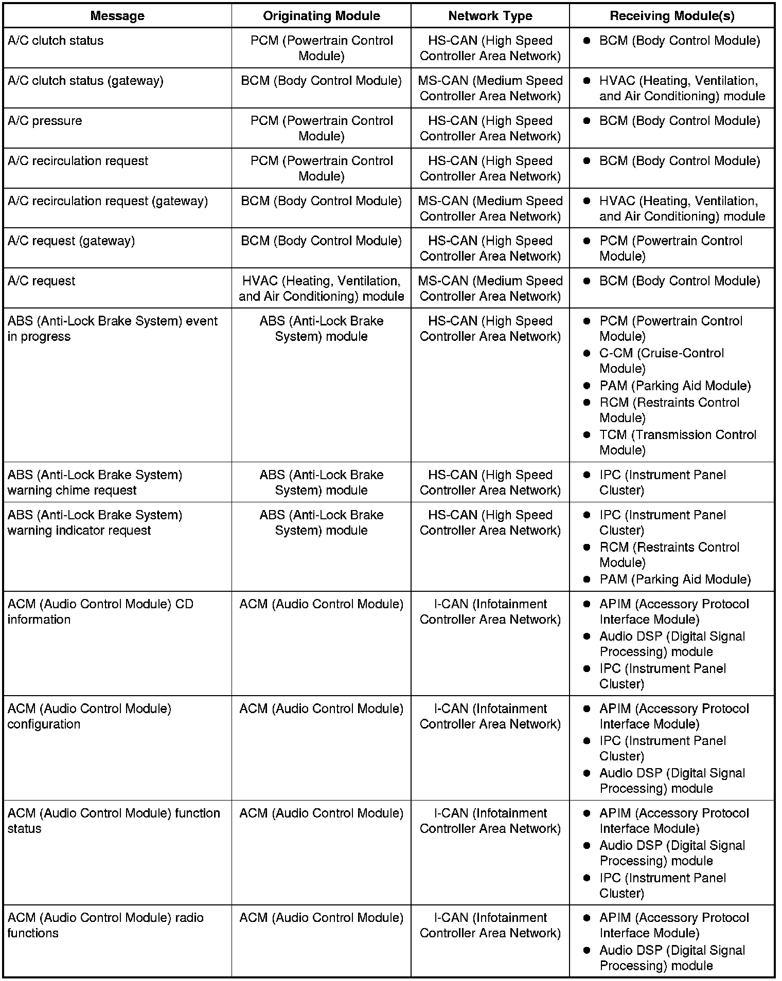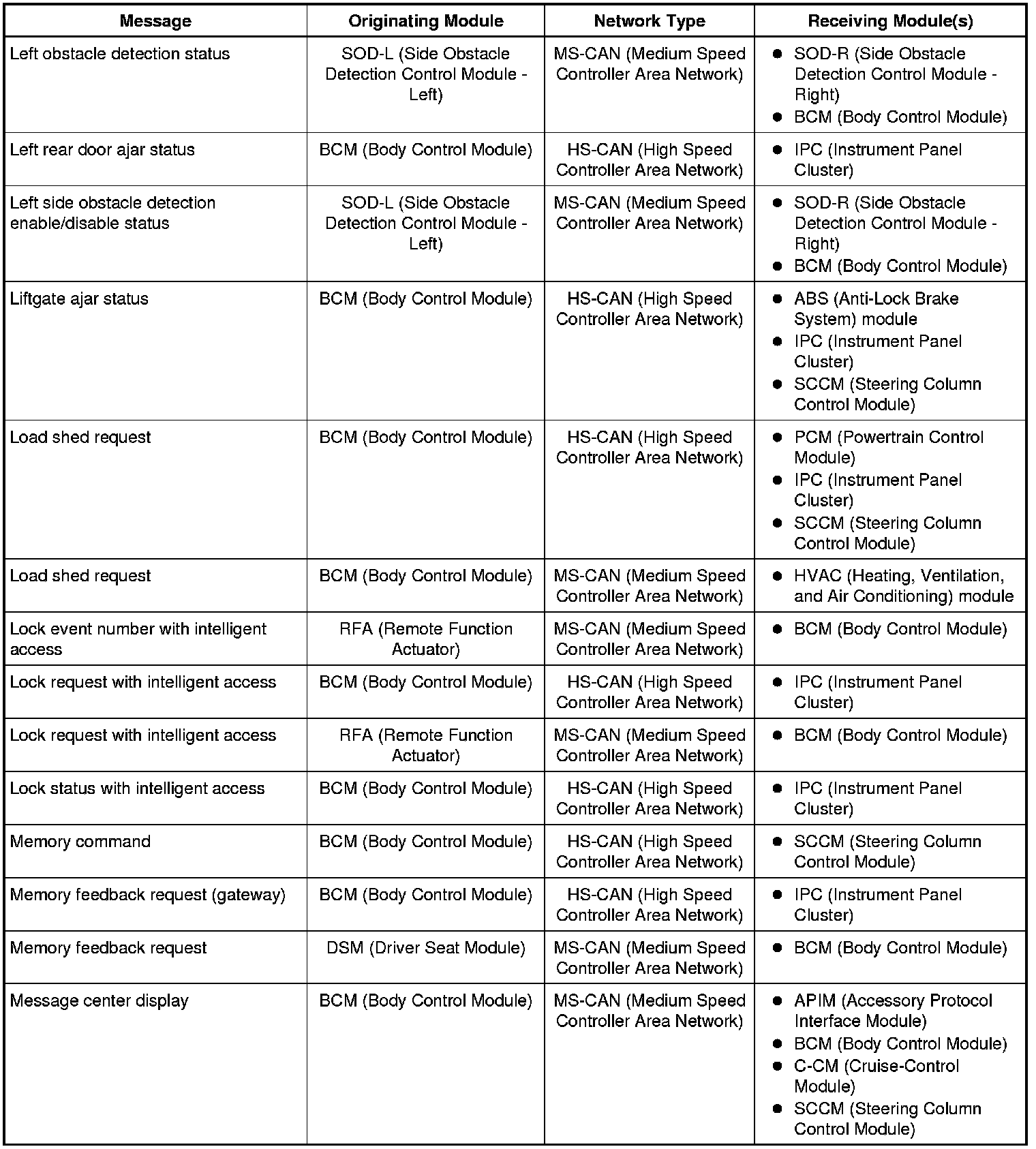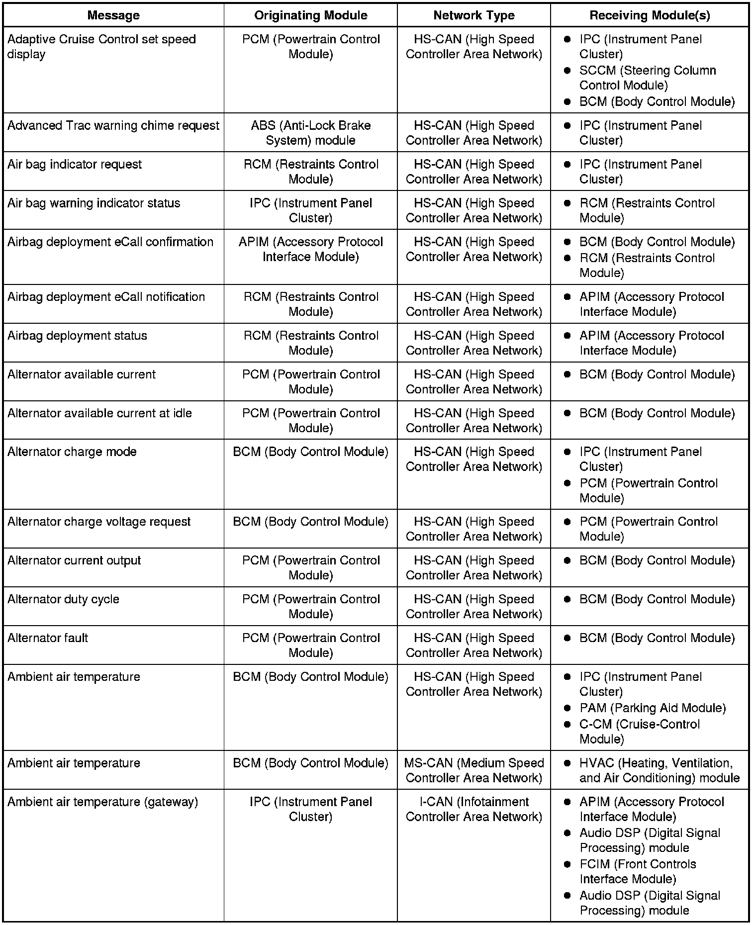 The IPC (Instrument Panel Cluster) and BCM (Body Control Module) are gateway modules. The IPC (Instrument Panel Cluster) translates messages on the HS-CAN (High Speed Controller Area Network) to the I-CAN (Infotainment Controller Area Network) and vice versa. The BCM (Body Control Module) translates messages on the HS-CAN (High Speed Controller Area Network) to the MS-CAN (Medium Speed Controller Area Network) and vice versa. This allows a message to be distributed throughout all three networks.