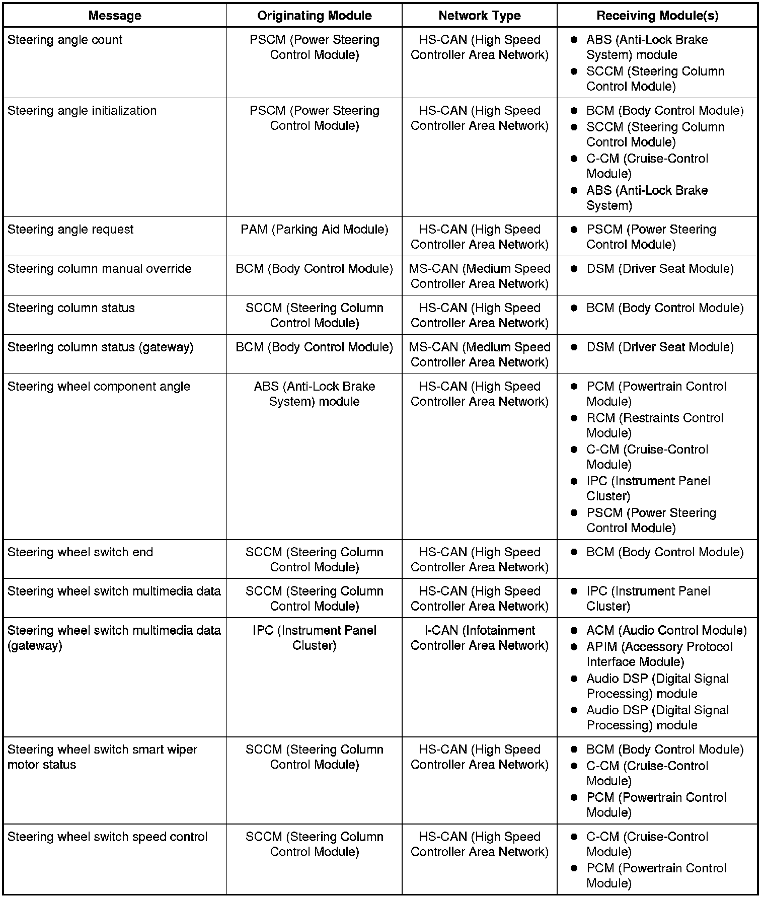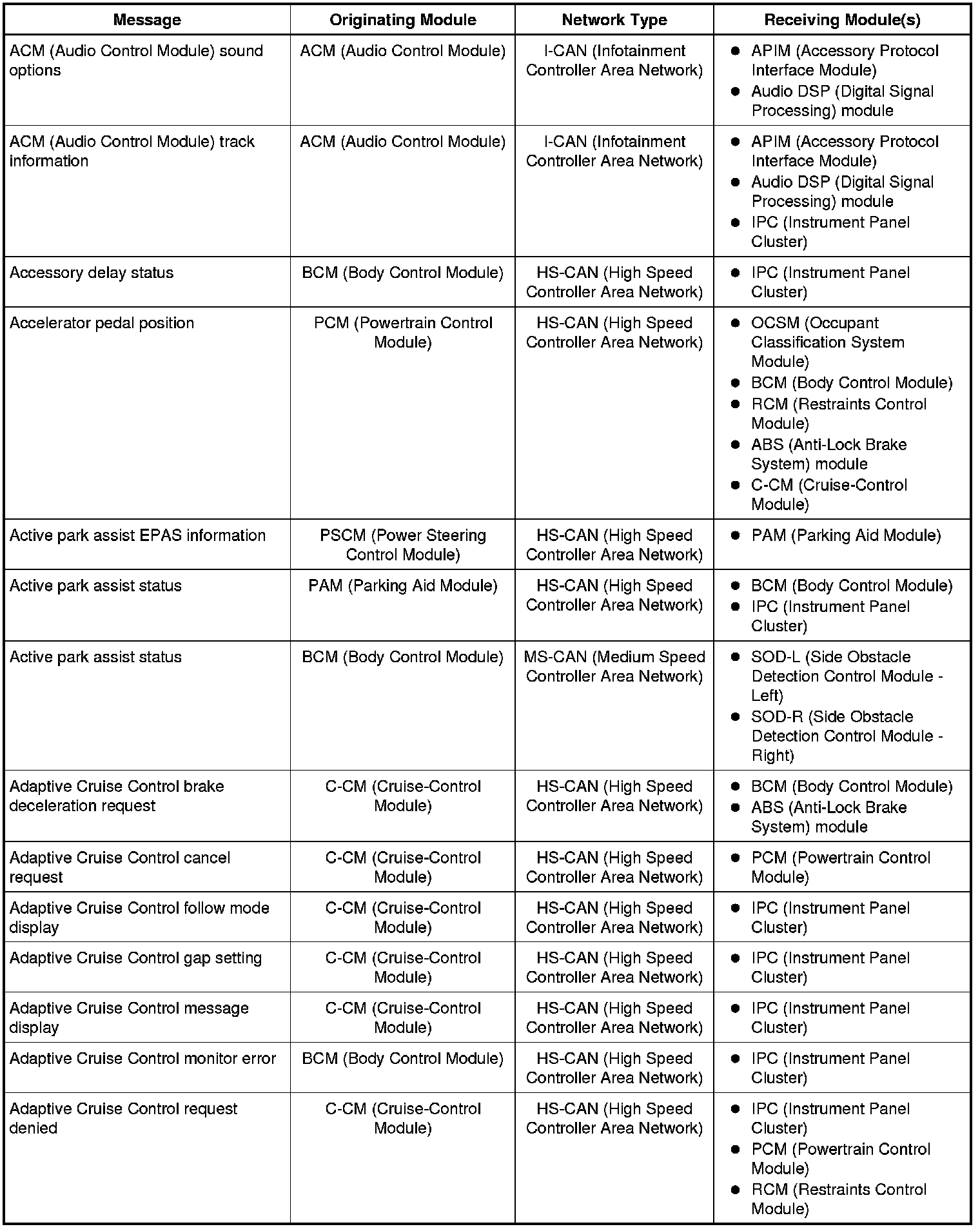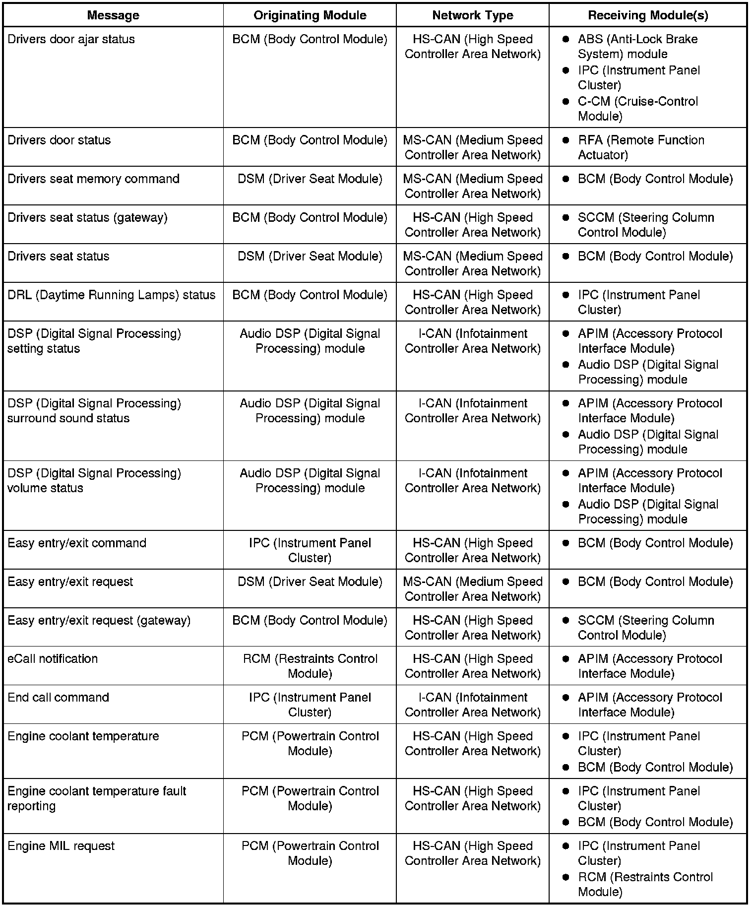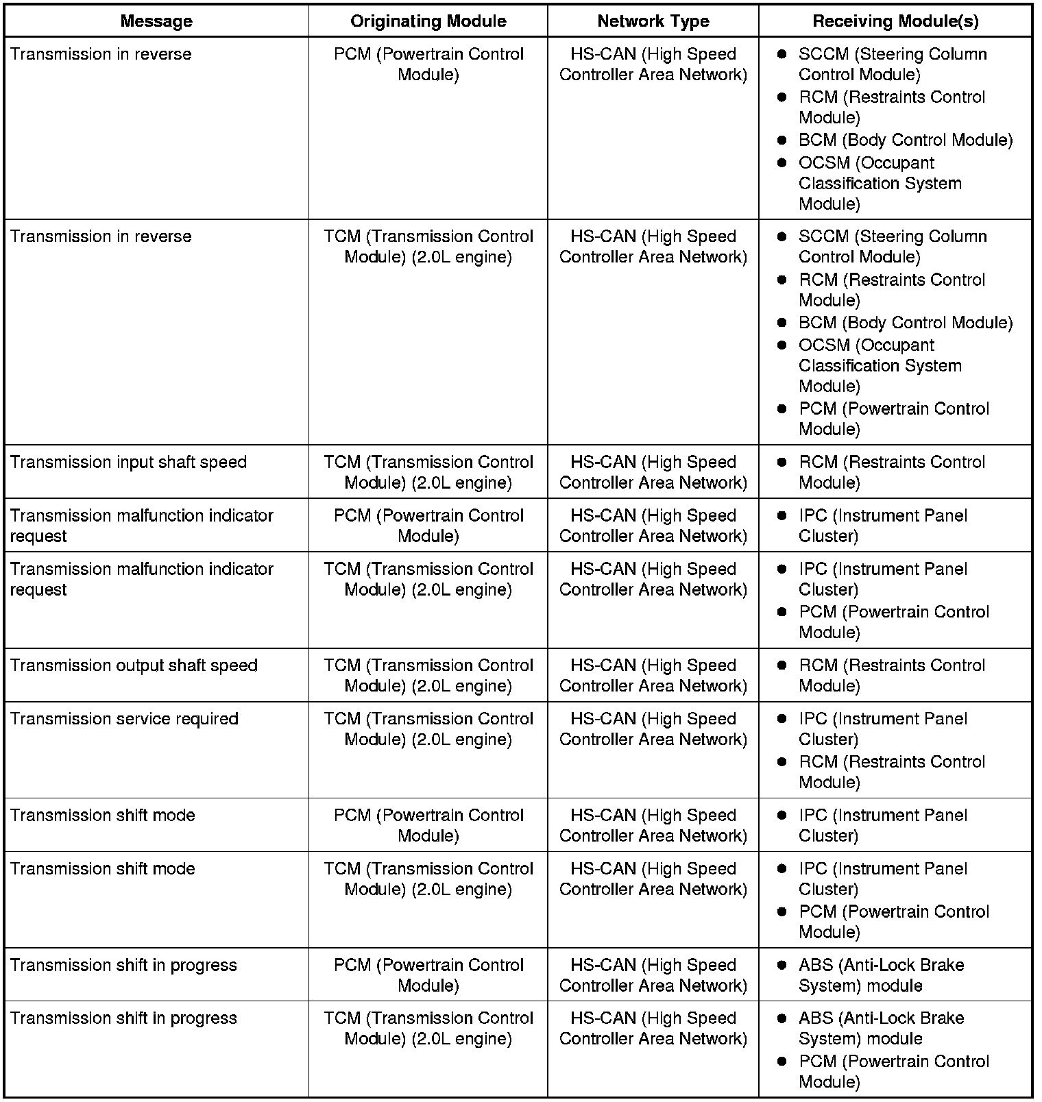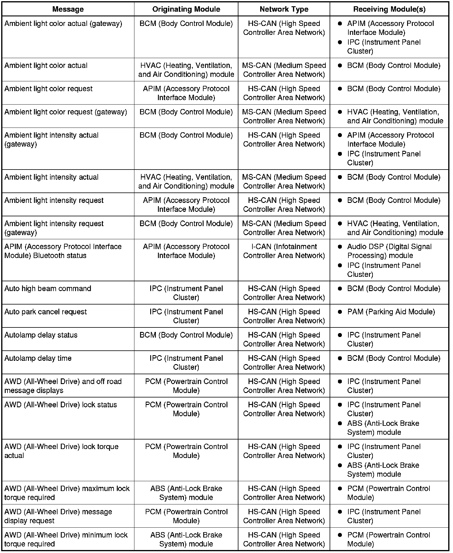 The IPC (Instrument Panel Cluster) and BCM (Body Control Module) are gateway modules. The IPC (Instrument Panel Cluster) translates messages on the HS-CAN (High Speed Controller Area Network) to the I-CAN (Infotainment Controller Area Network) and vice versa. The BCM (Body Control Module) translates messages on the HS-CAN (High Speed Controller Area Network) to the MS-CAN (Medium Speed Controller Area Network) and vice versa. This allows a message to be distributed throughout all three networks.