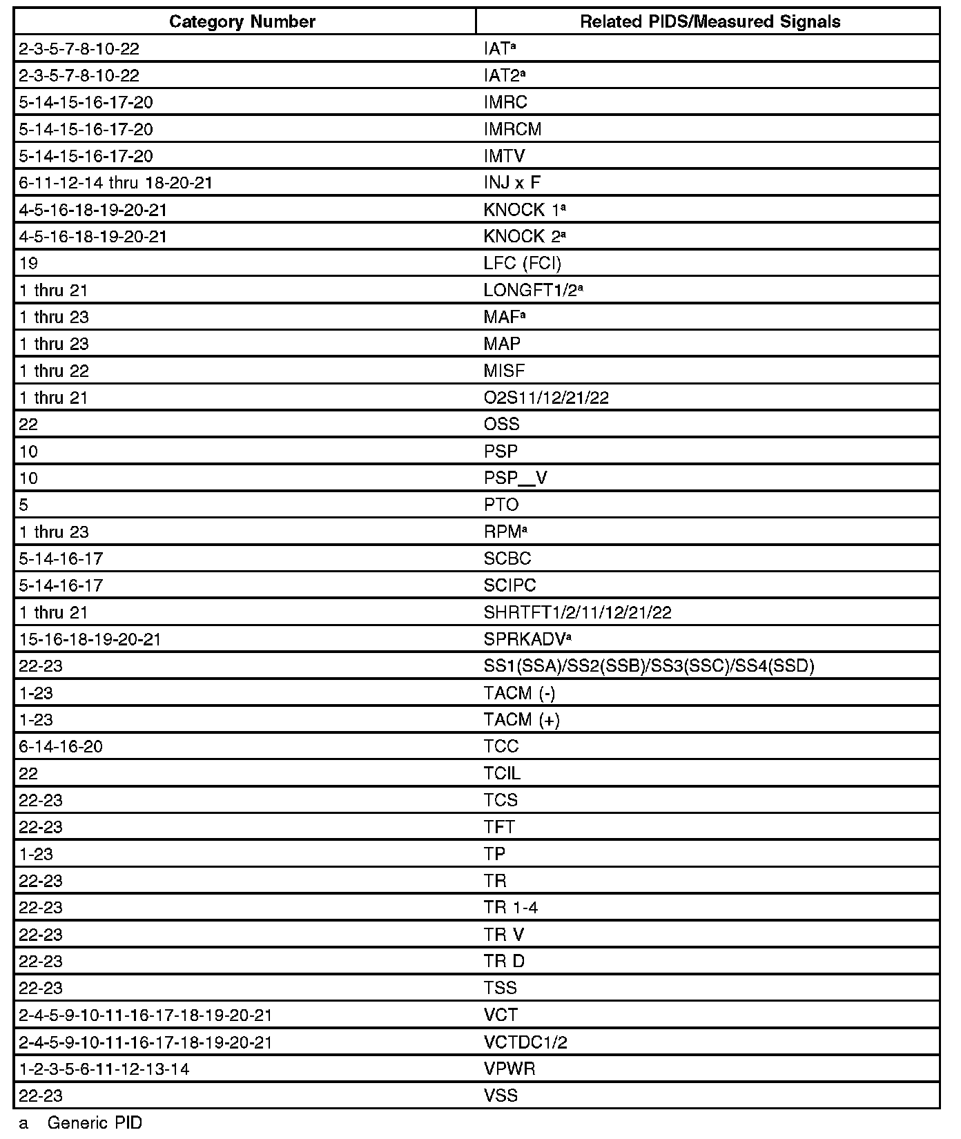 The following listing reflects PIDS and/or measured values which may reveal a possible concern within each system shown. Match the category number with the related PID/measured signal and go to the Typical Diagnostic Reference Value Charts. Typical Diagnostic Reference Values