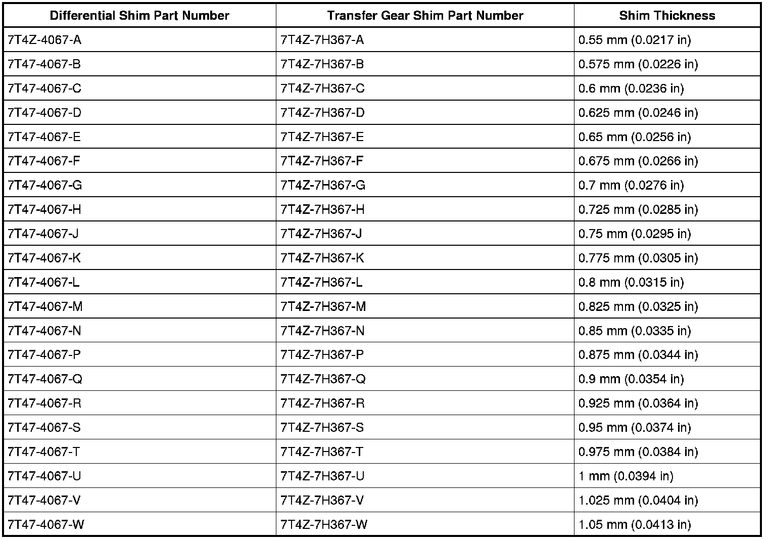 Differential and Transfer Gear Bearing Preload Shim Selection Chart
