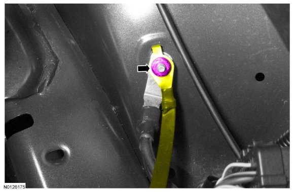 Remove the battery cable body ground terminal stud nut and position the ground strap aside.