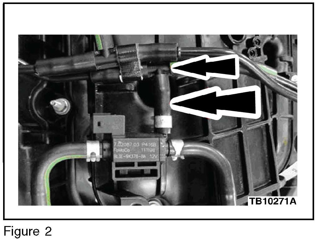 4. Remove the vacuum tee and vacuum supply hose connecting the turbocharger vacuum regulator solenoid to the upper intake manifold. (Figure 2)