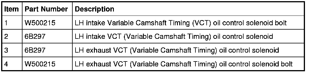 NOTE: It is necessary to remove the RH or LH valve cover to access the Variable Camshaft Timing (VCT) oil control solenoid. For additional information, refer to Engine.