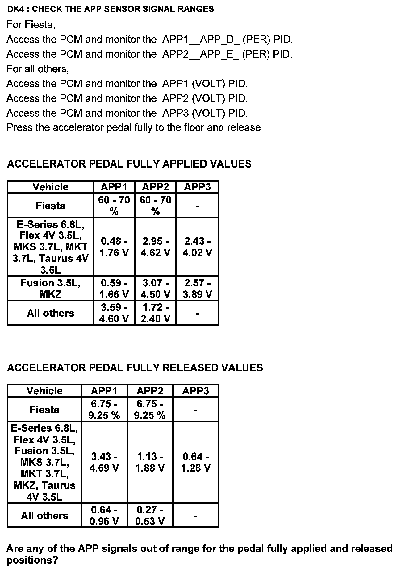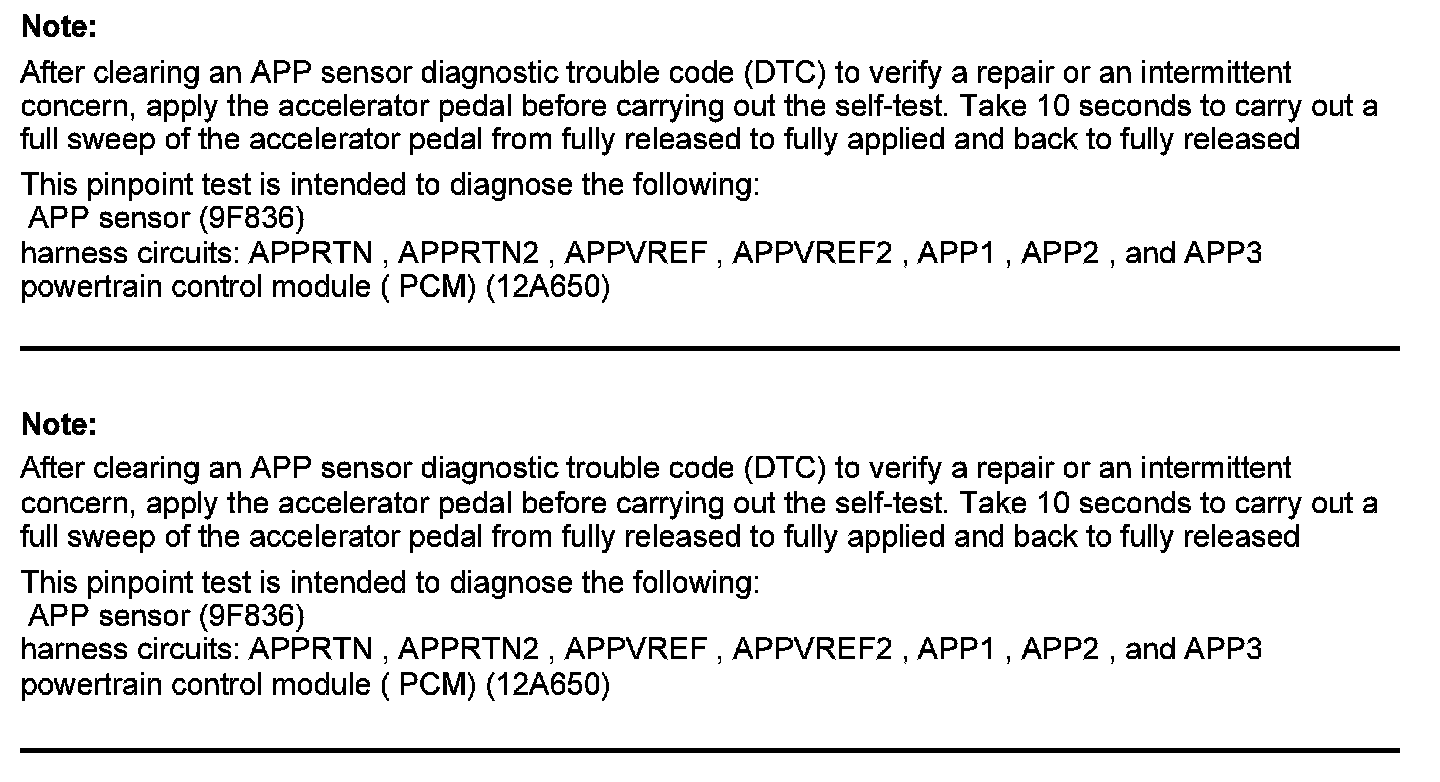 Home >> Ford >> 2012 >> F 150 2WD V6-3.7L >> Repair and Diagnosis >> Powertrain Management >> Computers and Control Systems >> Testing and Inspection >> Pinpoint Tests >> Test DK: Accelerator Pedal Position (APP) Sensor