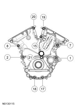 Install the engine front cover and bolts 1, 2, 7, 8, 15, 17, 18, 19, 20 and 21 and tighten sequence shown in 3 stages: