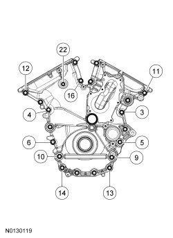 Install the remaining 12 engine front cover bolts 3, 4, 5, 6, 9, 10, 11, 12, 13, 14, 16 and 22. Tighten all of the engine front cover bolts in the sequence shown in 3 stages: