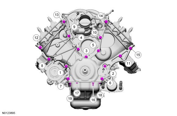 Stage 1: Tighten bolts 1-15 to 25 Nm (18 lb-ft) and bolts 16-19 to 10 Nm (89 lb-in).