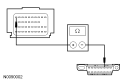 - Measure the resistance between the RCM (Restraints Control Module) C310B-9, circuit VDB05 (WH), harness side and the DLC (Data Link Connector) C251-14, circuit VDB05 (WH), harness side.