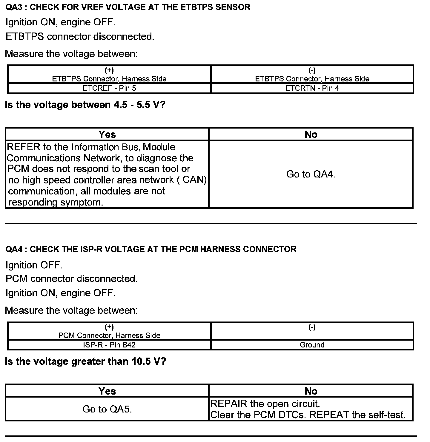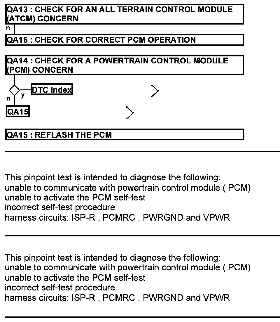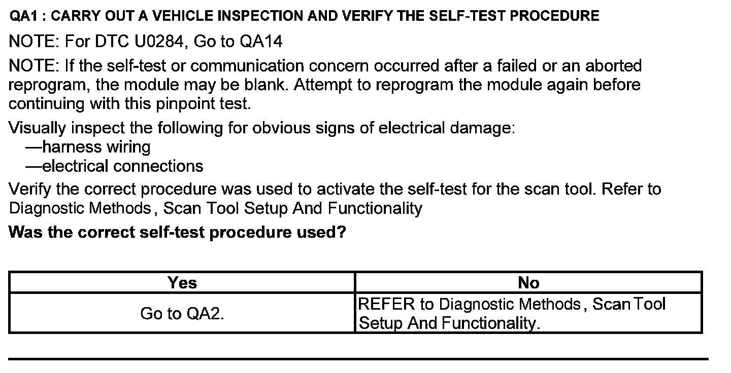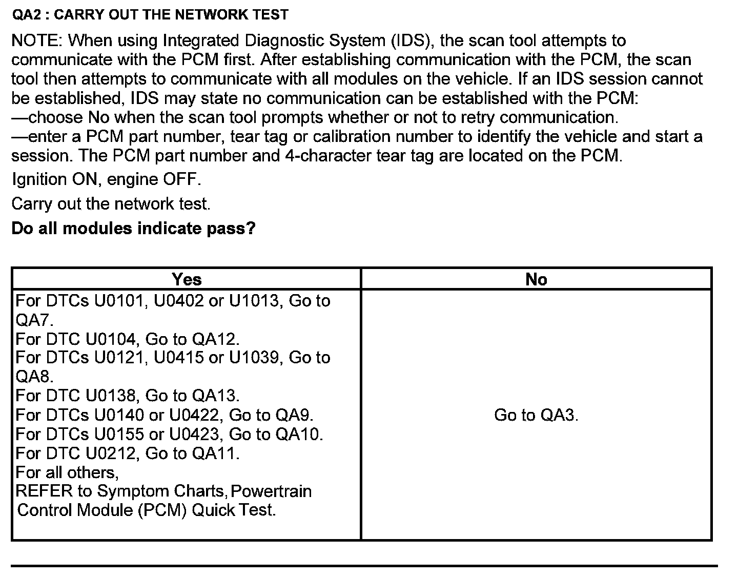Home >> Ford >> 2012 >> F 150 2WD V8-6.2L >> Repair and Diagnosis >> Powertrain Management >> Computers and Control Systems >> Testing and Inspection >> Pinpoint Tests >> Test QA: Unable to Activate Self-Test/Network Communication Error