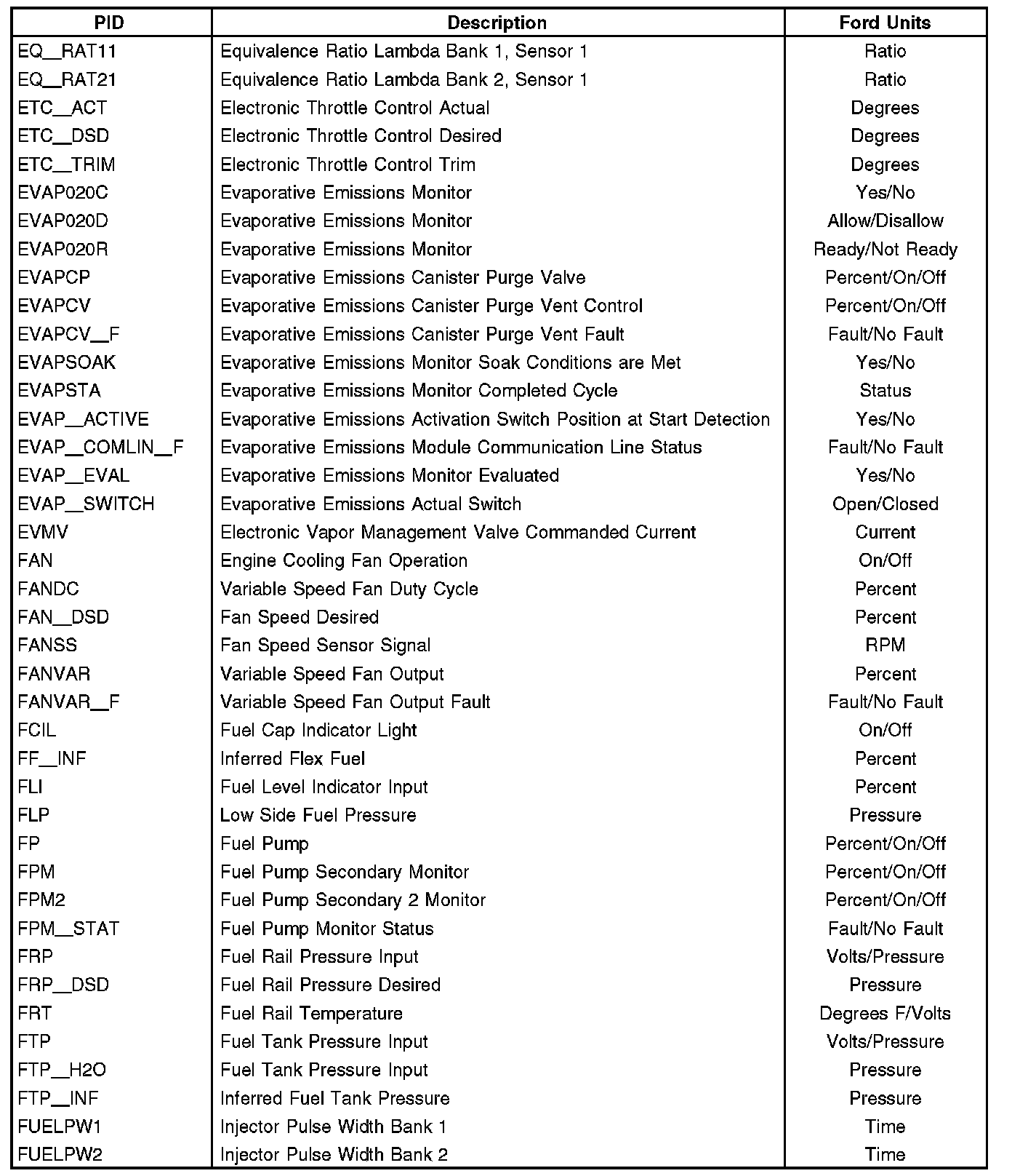 The PID mode allows access to powertrain control module (PCM) information. This includes analog and digital signal inputs and outputs along with calculated values and the system status. There are two types of PID lists available and both are used throughout. The first is the generic (J1979) OBD PID list. This is a standard set of PIDs that all scan tools must be able to access. The second is a Ford specific (J2190) list which can be accessed by an appropriate scan tool. When accessing any of these PIDs, the values are continuously updated. The generic or Ford PID list provides definitions and values in appropriate units.