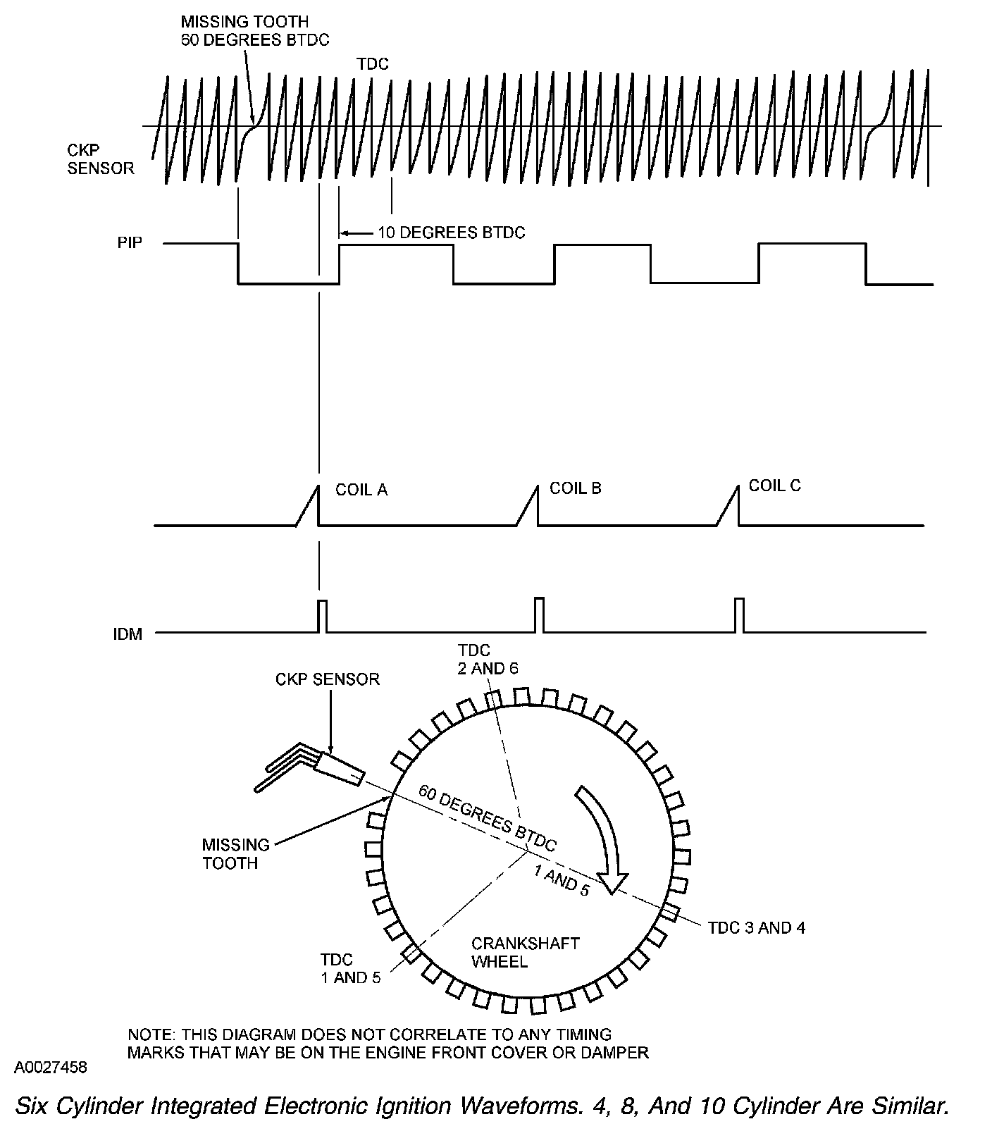 2. The PCM uses the CKP sensor signal to calculate a spark target and then fires the coil pack(s) to that target shown. The PCM uses the CMP sensor signal to identify the compression stroke of cylinder 1, and to synchronize the firing of the individual coils.