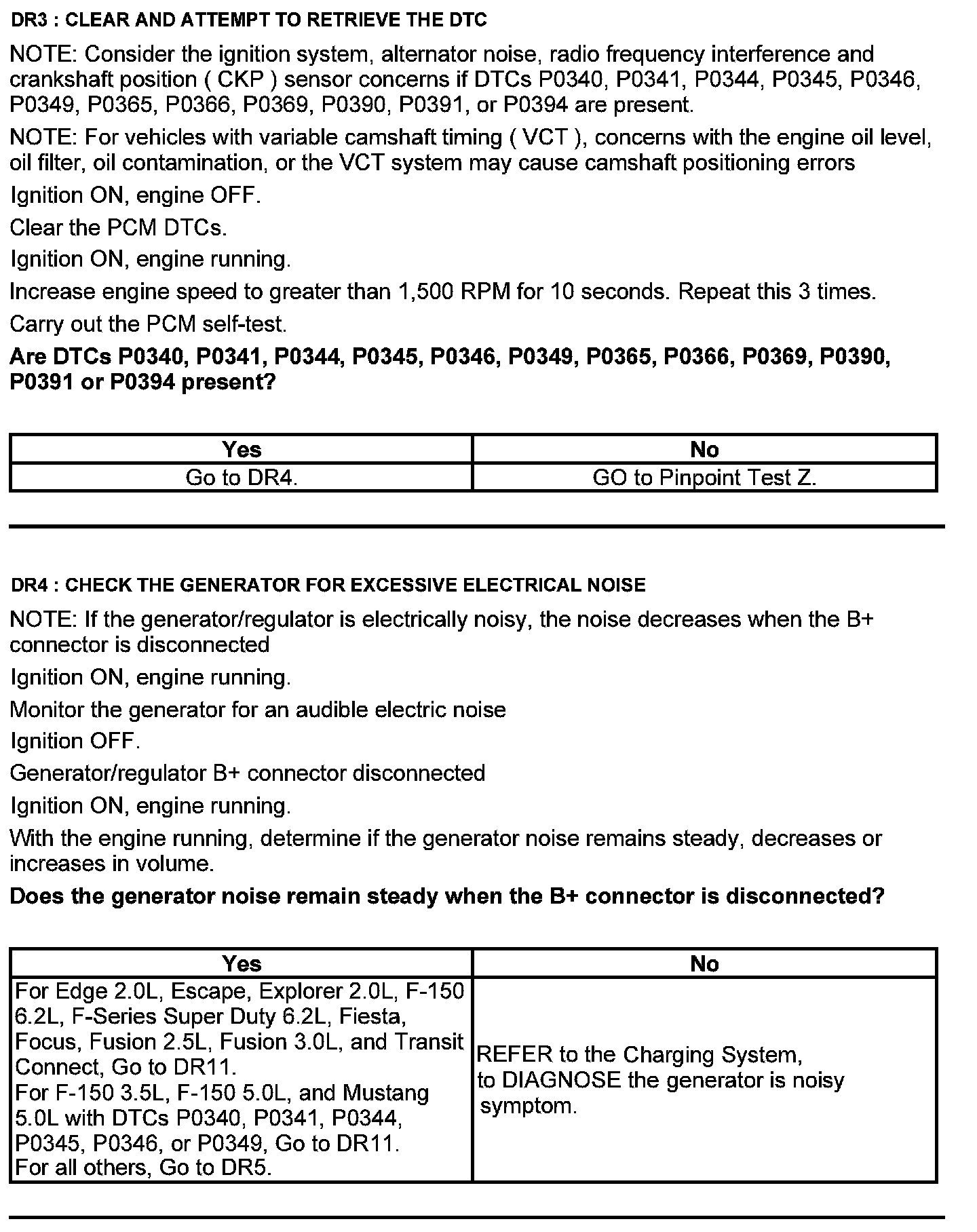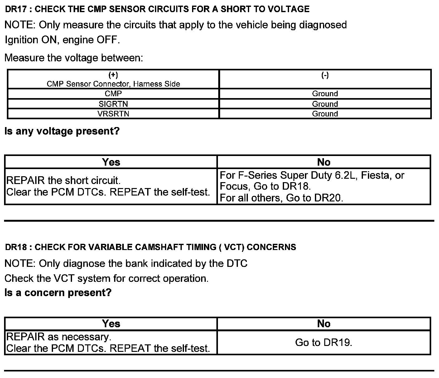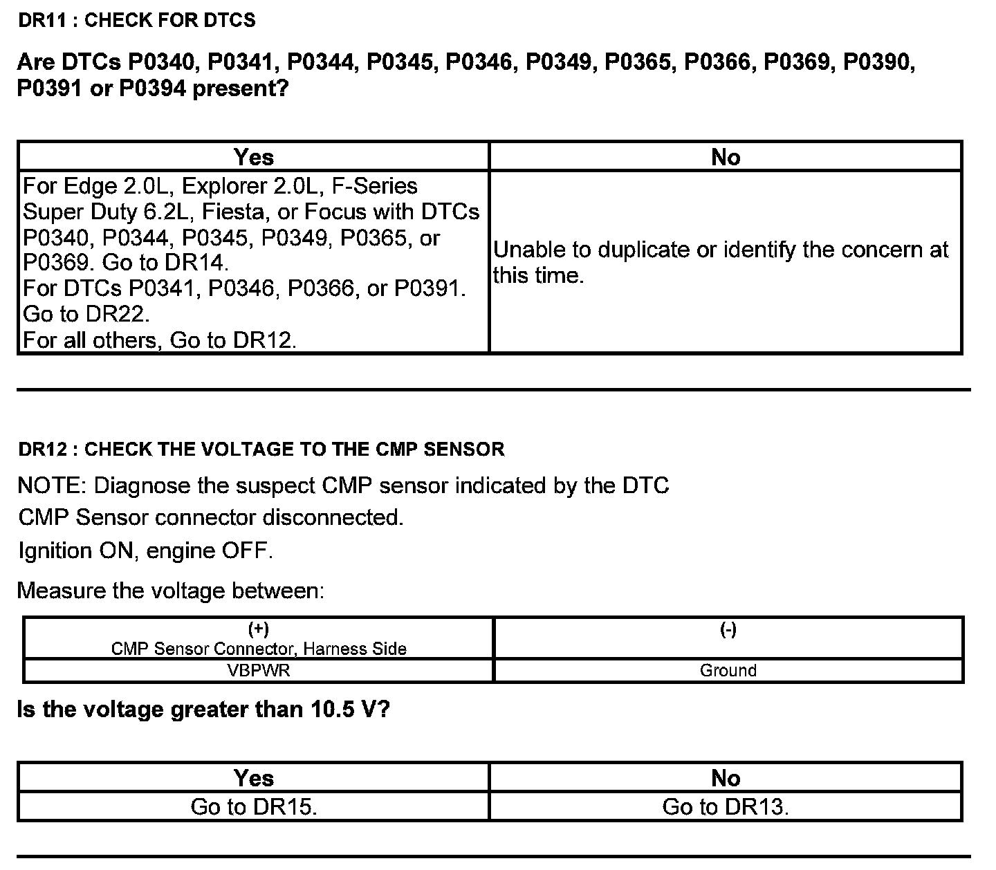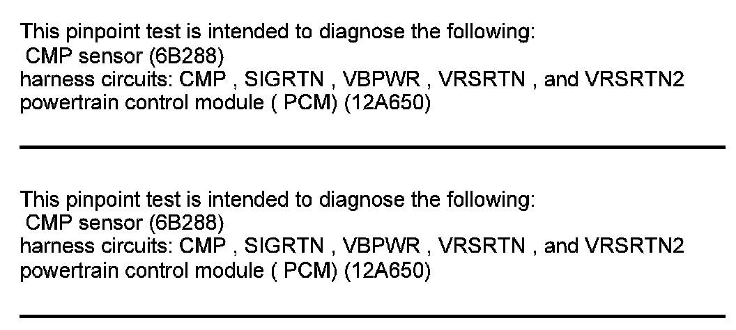 Home >> Ford >> 2012 >> F 150 4WD V6-3.7L >> Repair and Diagnosis >> Powertrain Management >> Computers and Control Systems >> Testing and Inspection >> Pinpoint Tests >> Test DR: Camshaft Position (CMP) Sensor