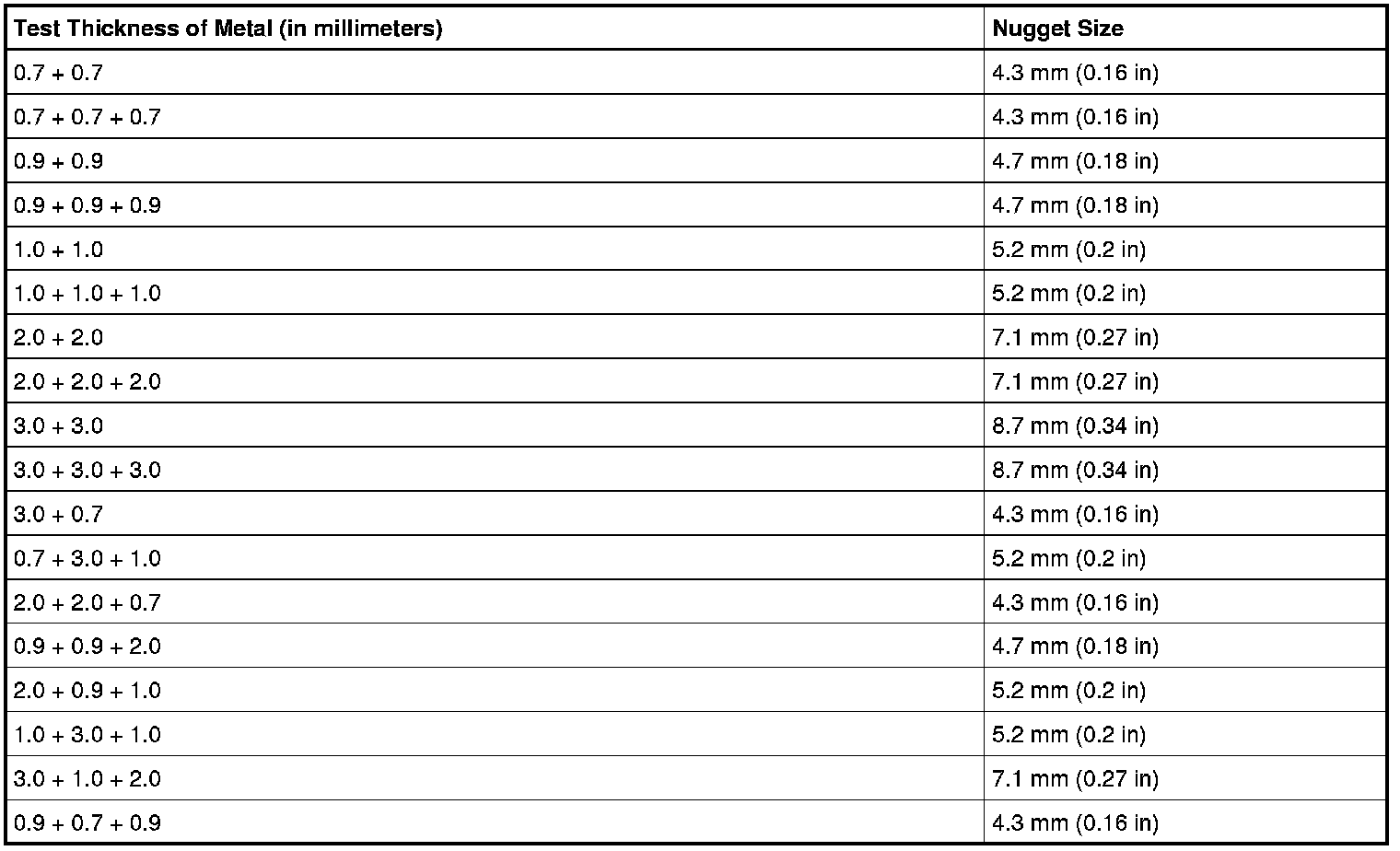 Weld Nugget Chart