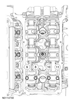 Tighten bolts 8, 9, 10 and 11 to 8 Nm (71 lb-in) then additional 45 degrees.