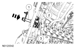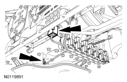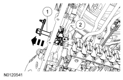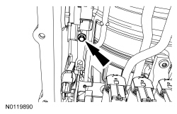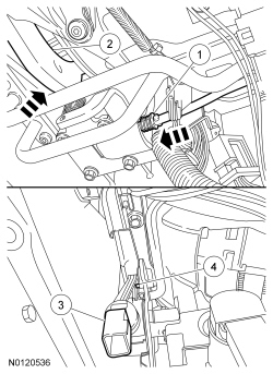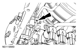 4. Disconnect the Transmission Fluid Temperature (TFT) sensor electrical connector and the Transmission Range (TR) sensor electrical connector and position the transmission wiring harness retainer aside.