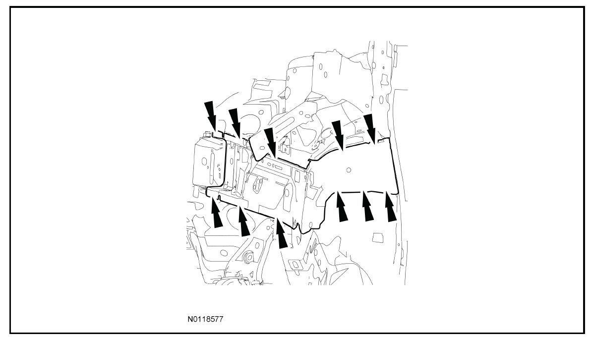 NOTICE: A frame rail sectioning kit is not available for this vehicle. Frame rail replacement must be done at the factory seams. Failure to follow this direction will result in an incorrect repair and vehicle energy management will be compromised.