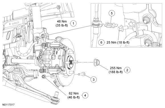 NOTICE: Do not tighten the wheel hub nut with the vehicle on the ground. Tighten the nut to specification before the vehicle is lowered onto the wheels. Wheel bearing damage will occur if the wheel bearing is loaded with the weight of the vehicle applied.