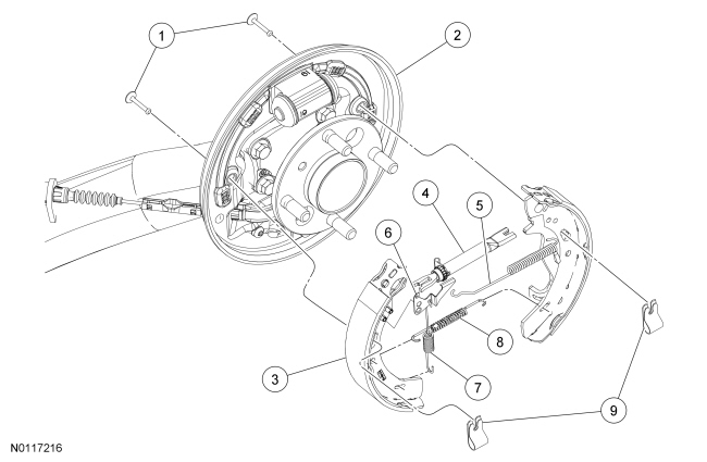 NOTE: If removing the the drum brake backing plate, the wheel hub and bearing must be removed. For additional information, refer to Rear Suspension Service and Repair.
