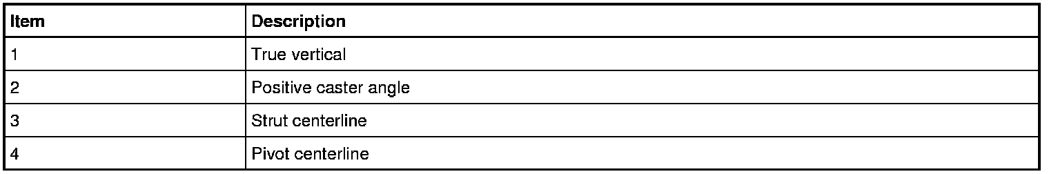 Caster is the deviation from vertical of an imaginary line drawn through the pivot points (top of strut and lower ball joint), when viewed from the side. The caster specifications will give the vehicle the best directional stability characteristics when loaded and driven. The caster setting is not related to tire wear. The caster setting is not adjustable.